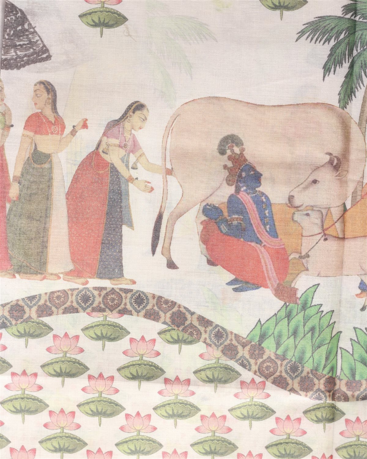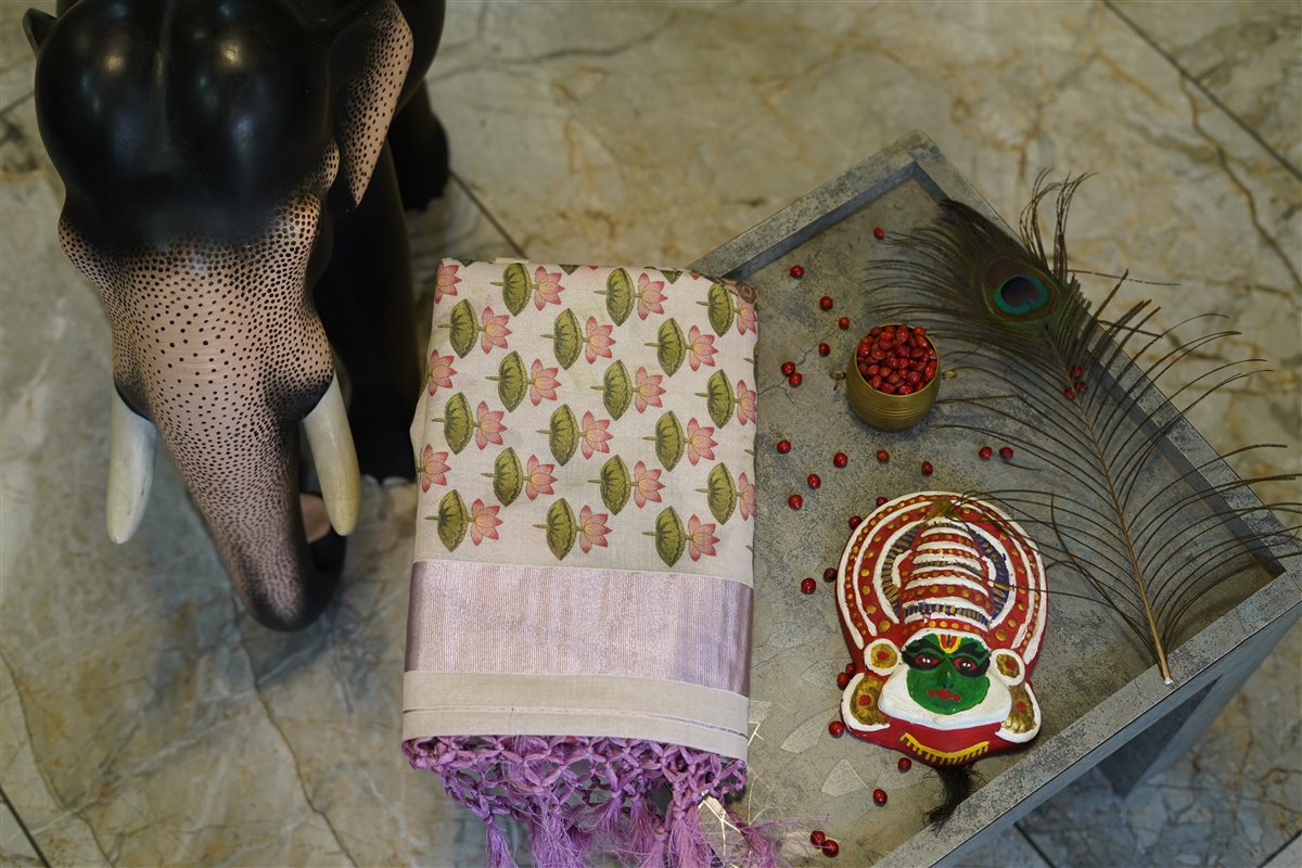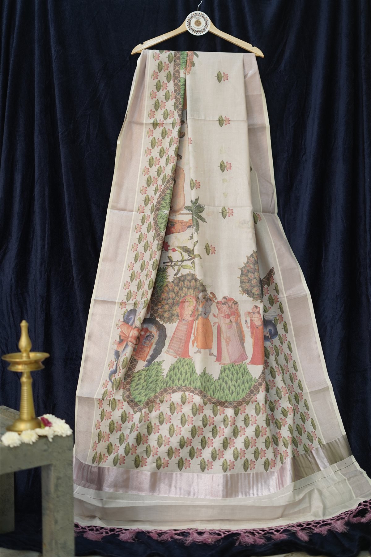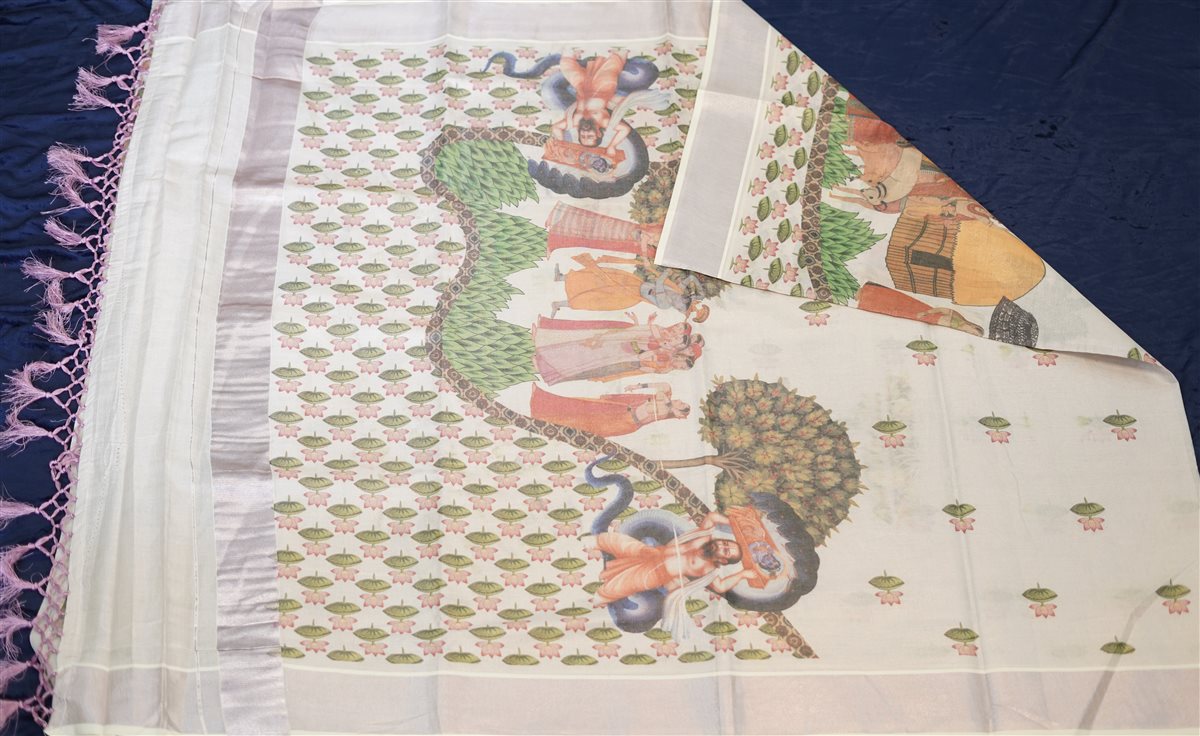 An exquisite Krishna Leela heritage weave saree in soft rosegold hues, adorned with intricate storytelling motifs that celebrate divine grace and timeless artistry.