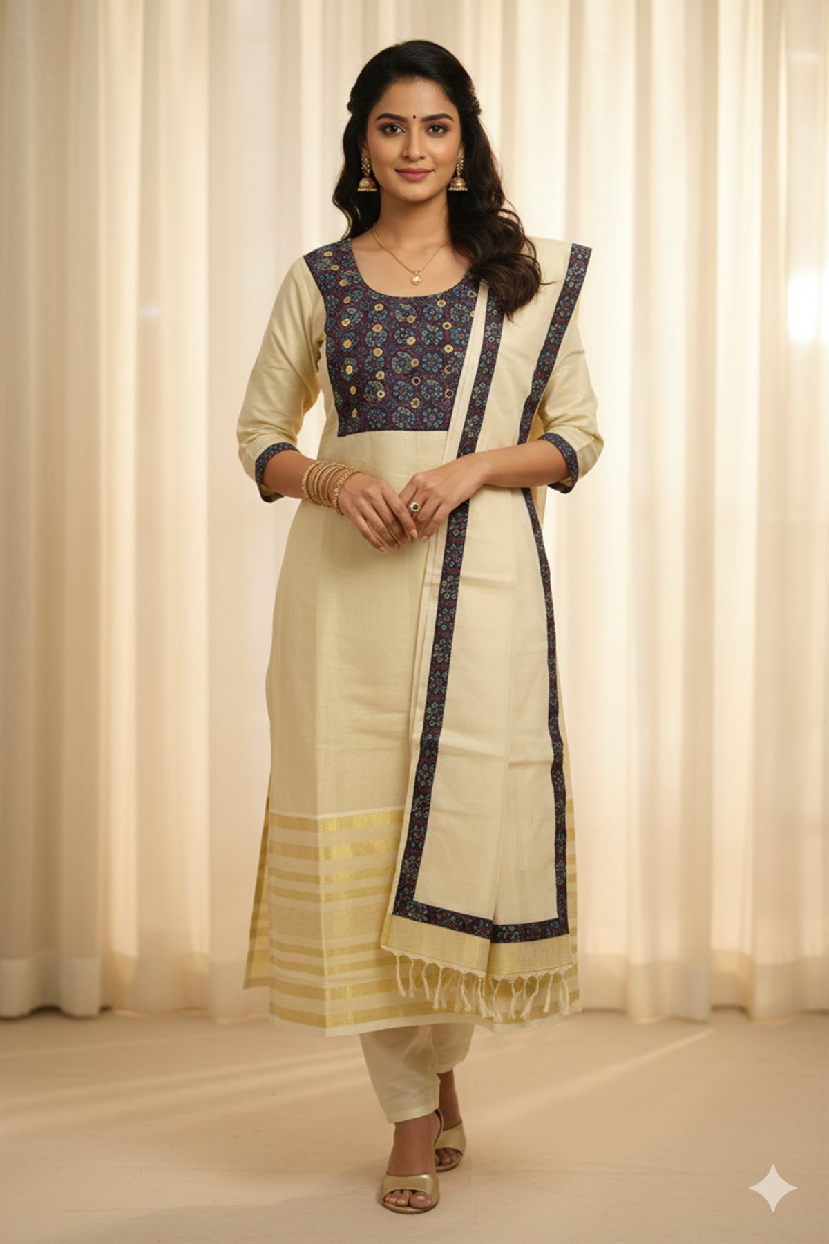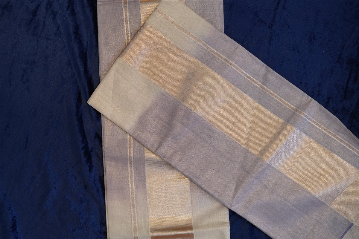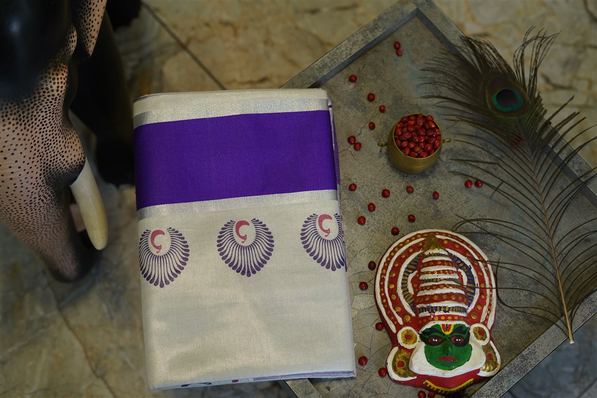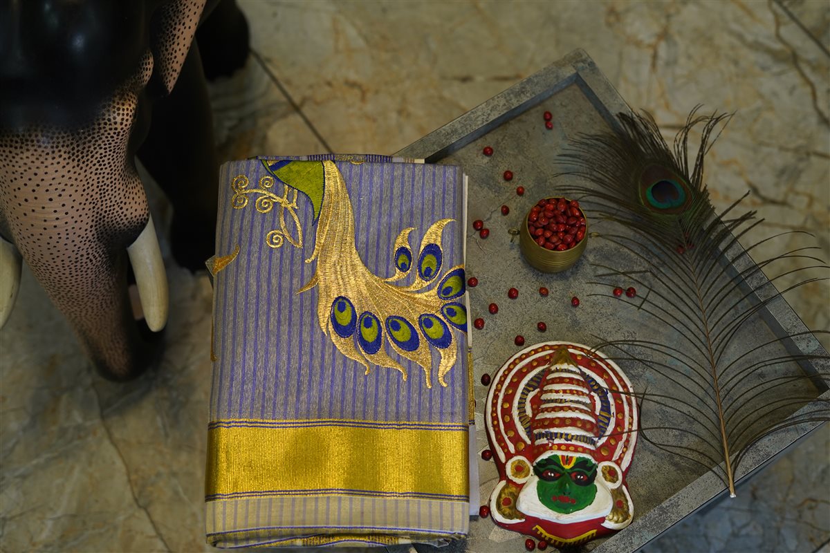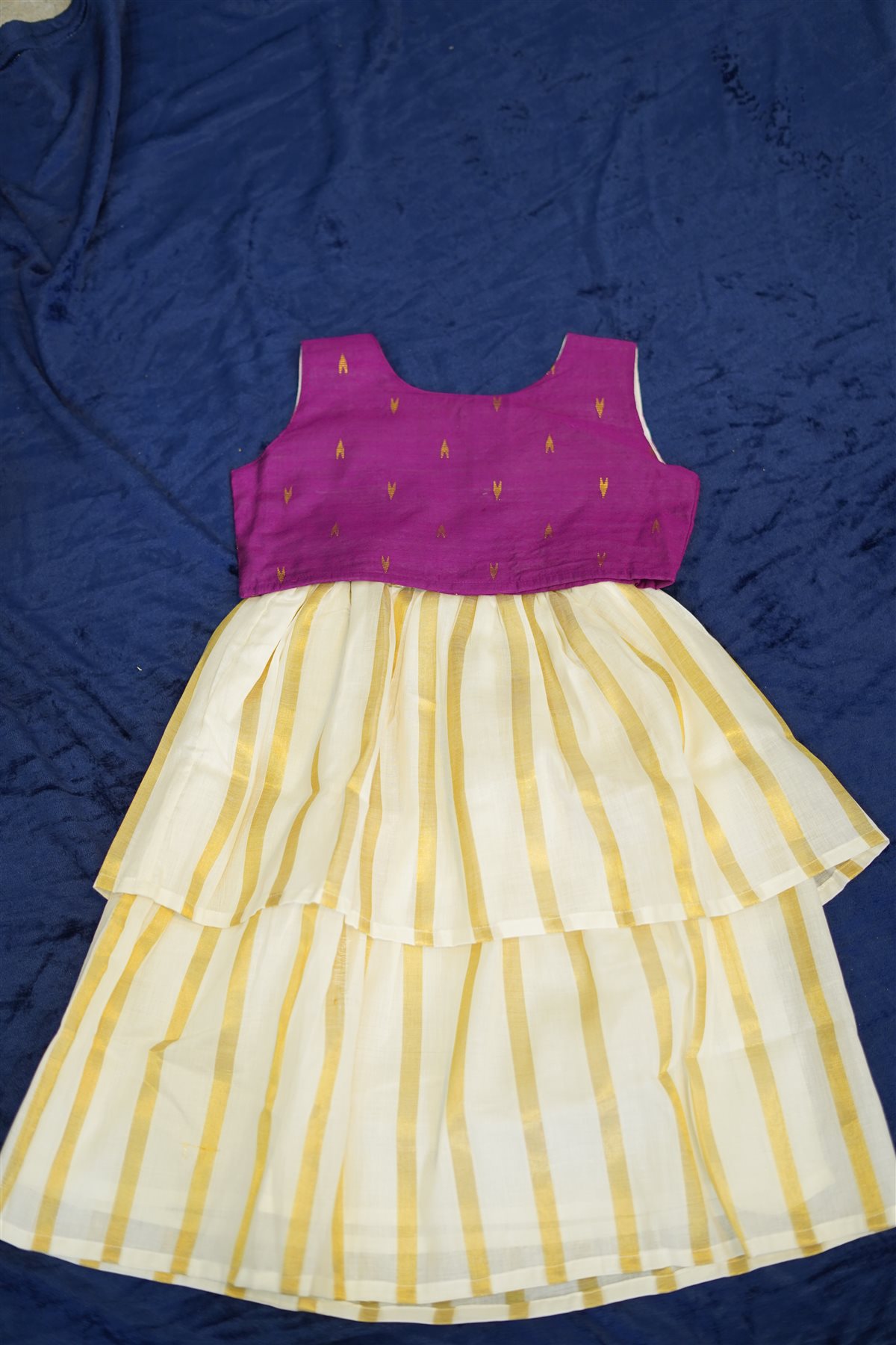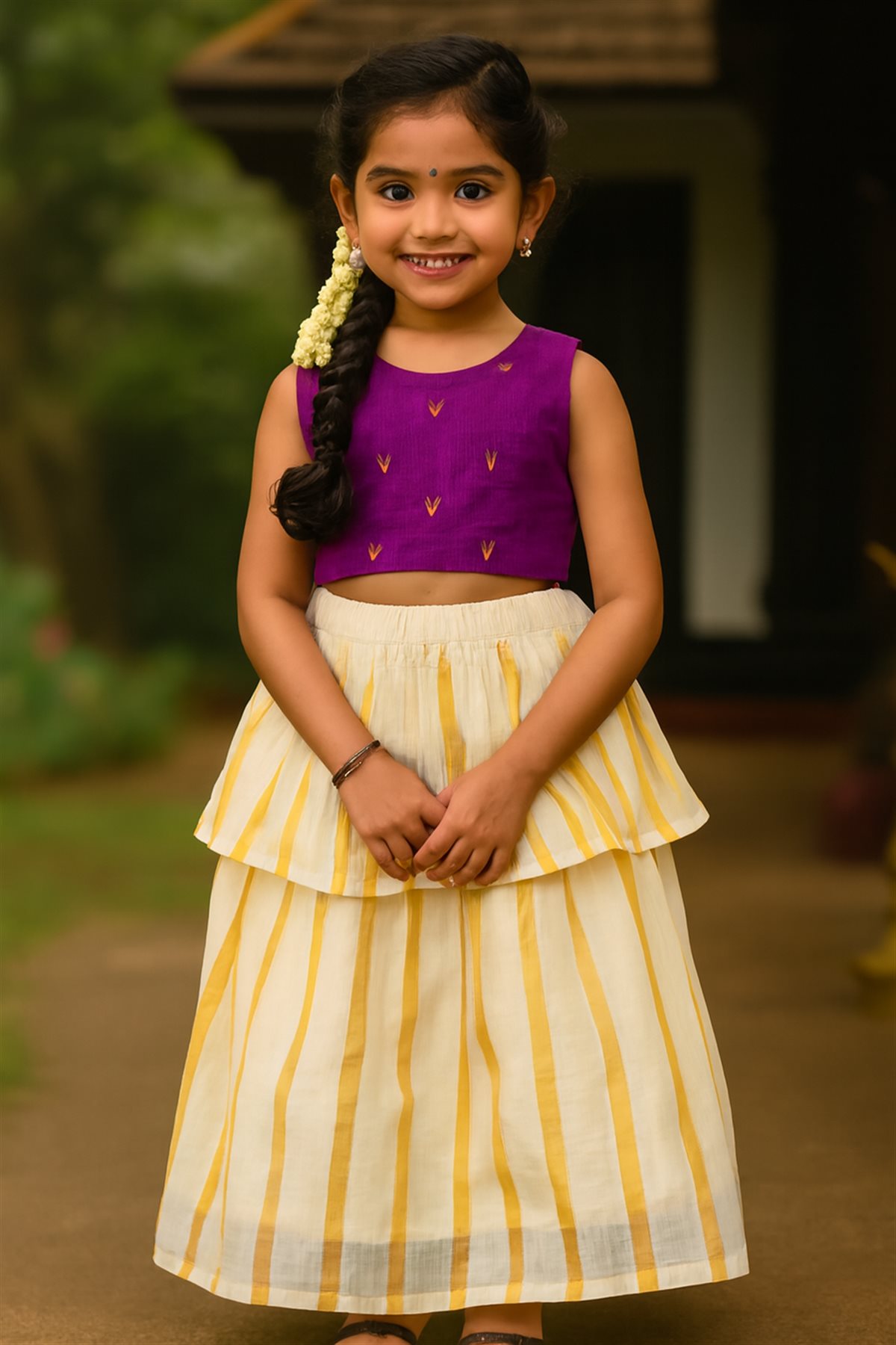Cream skirt with yellow stripes paired with a purple blouse adorned with golden motifs