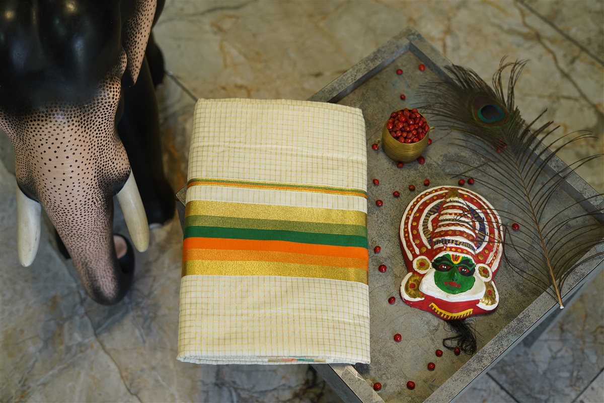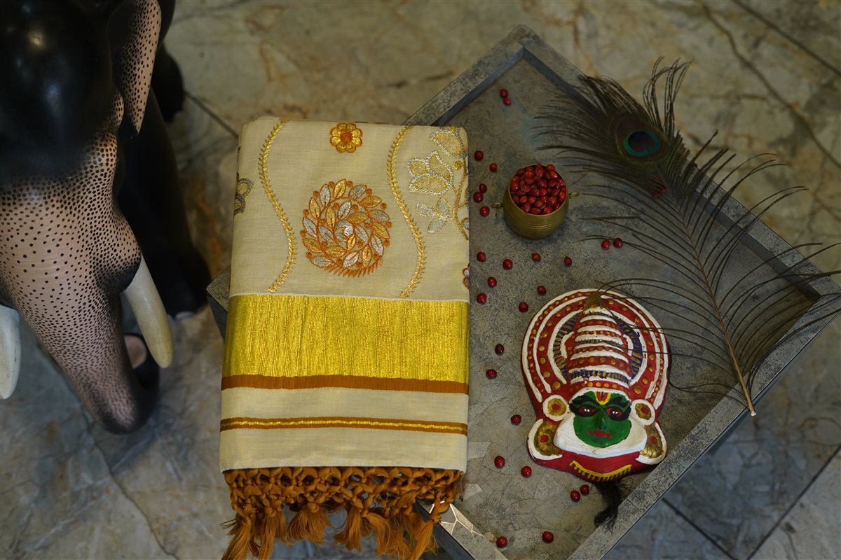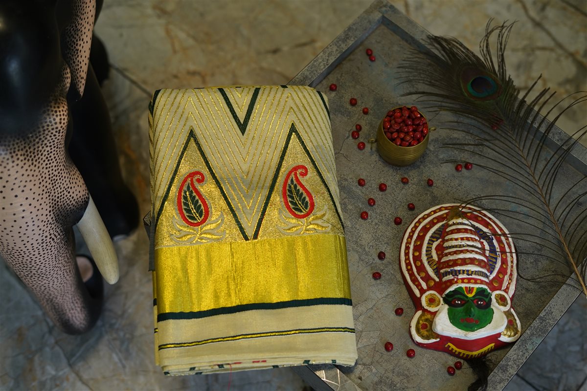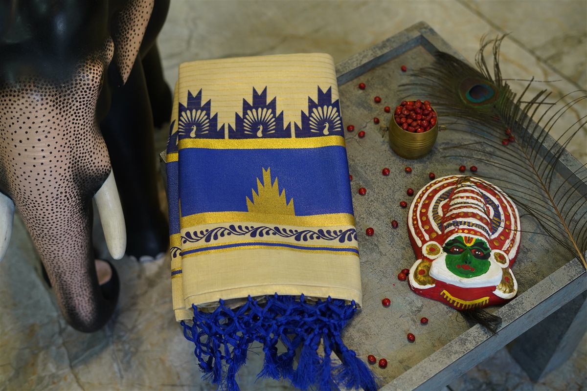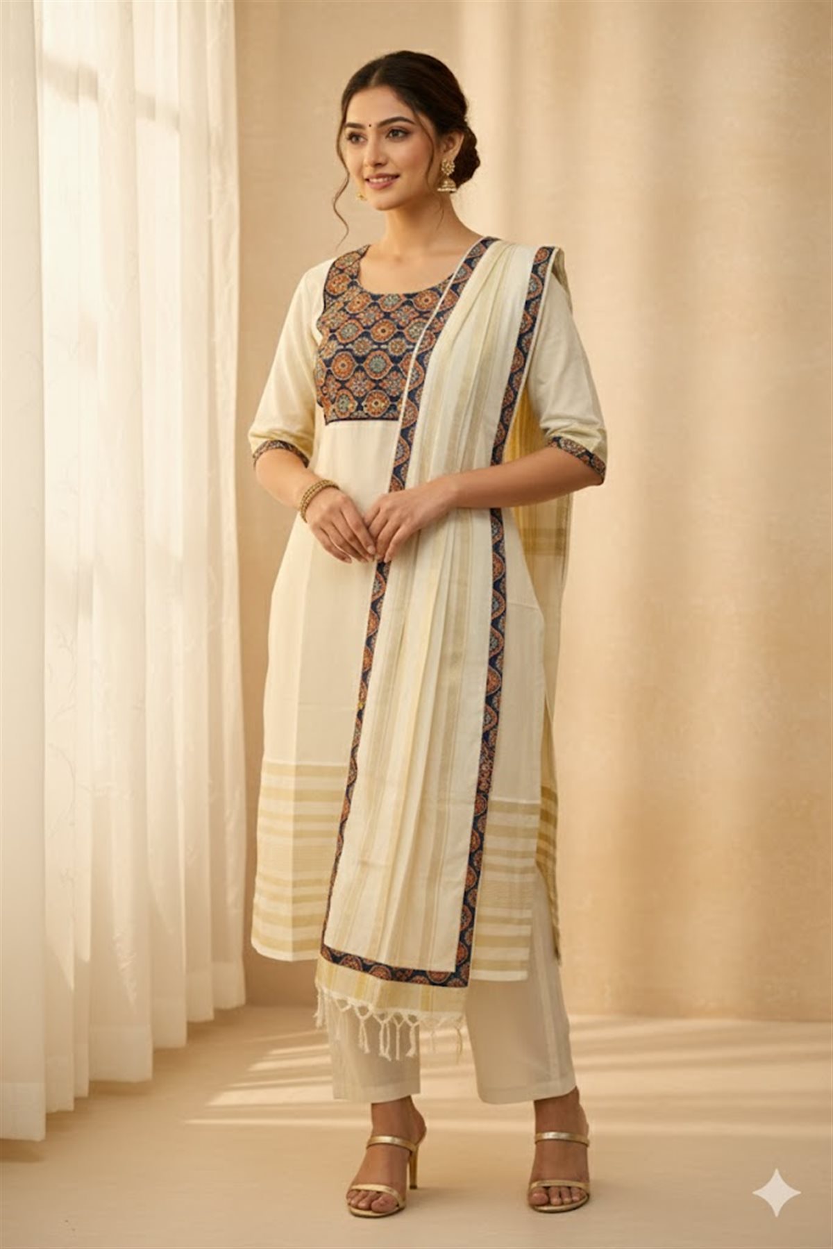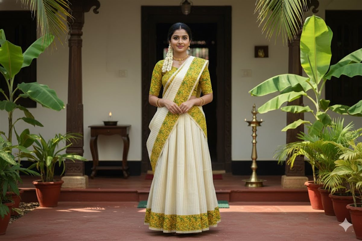 Cream skirt with yellow stripes paired with a purple blouse adorned with golden motifs