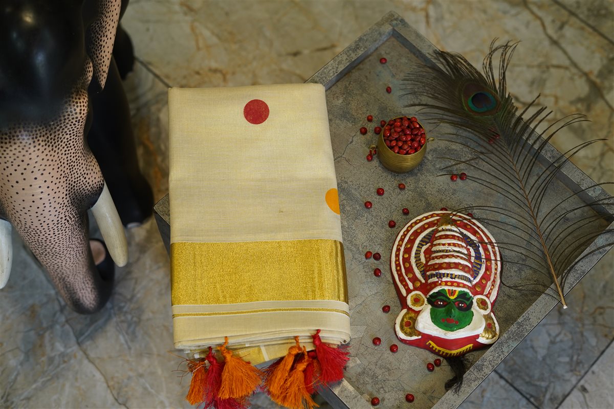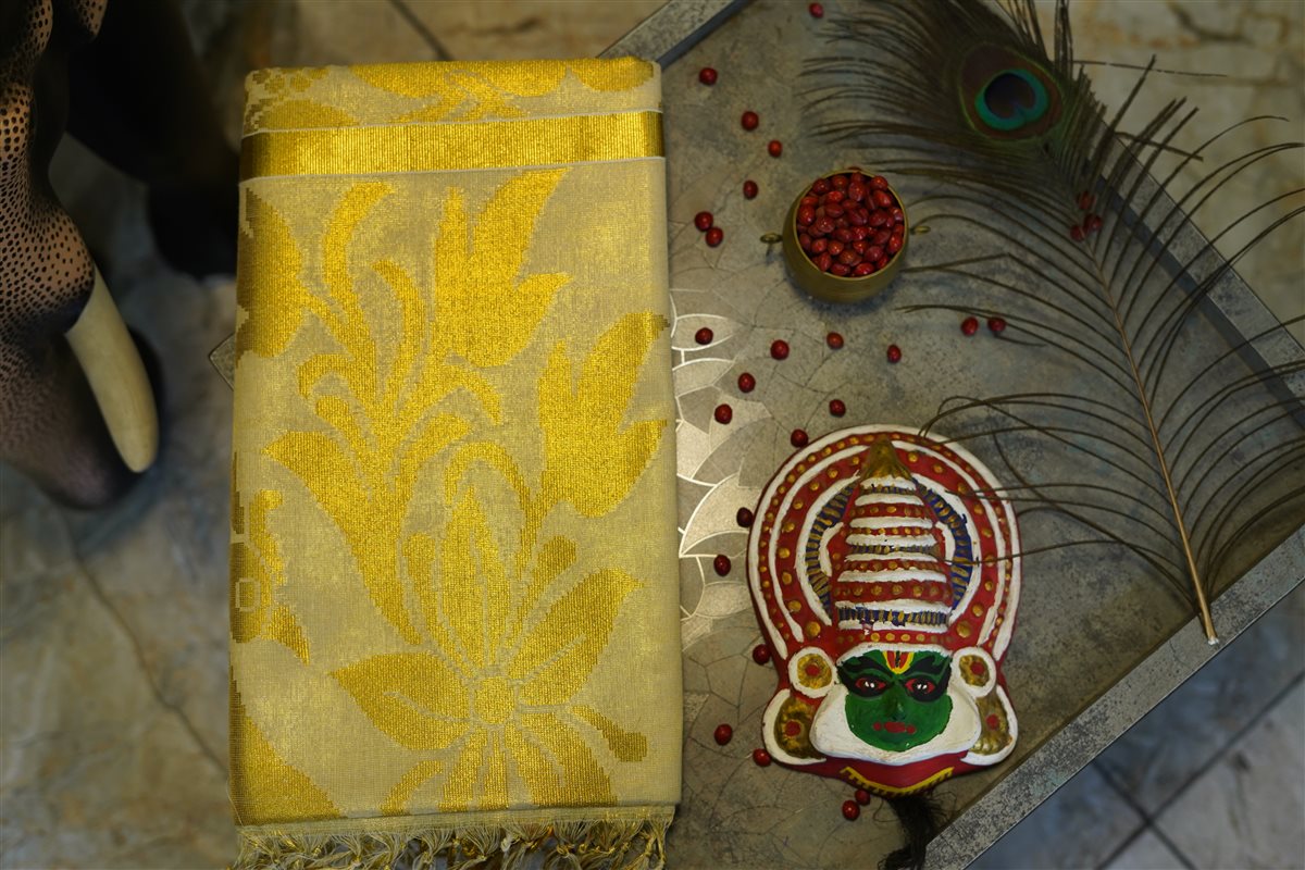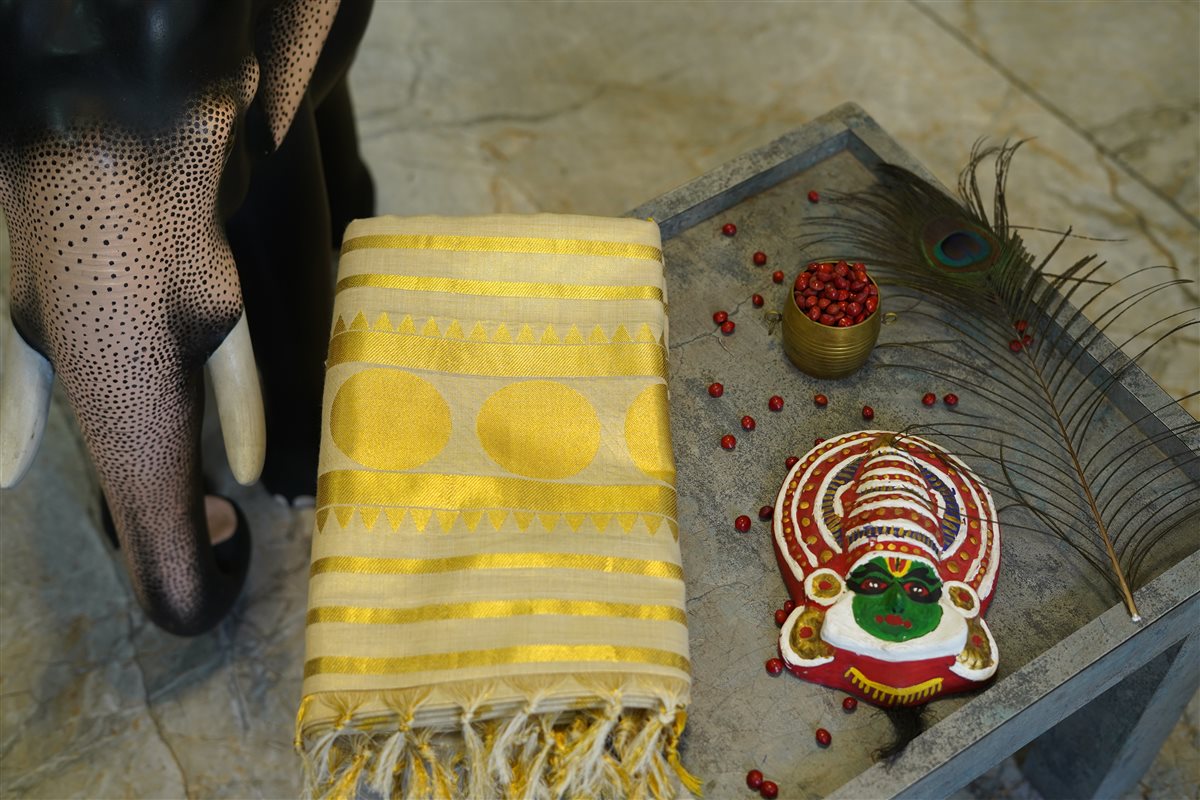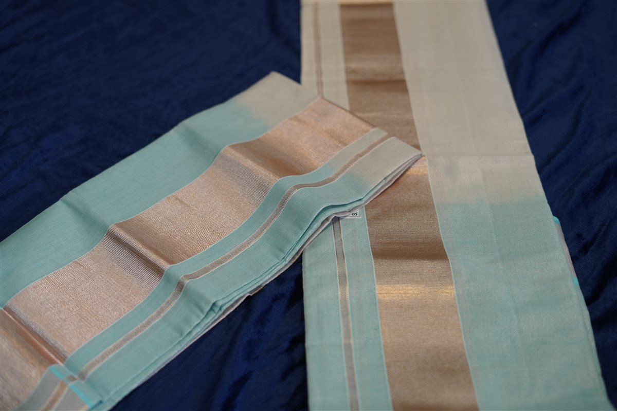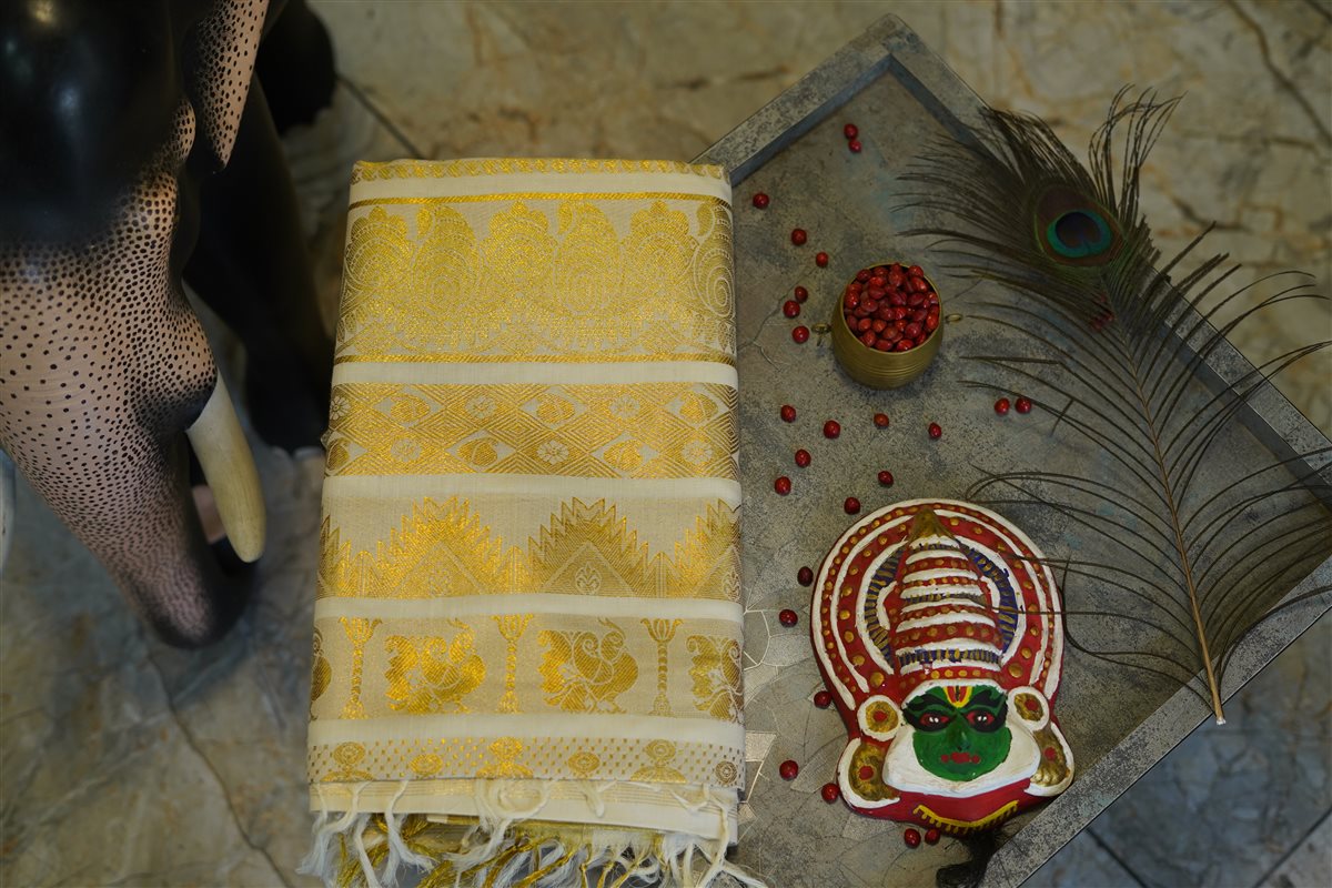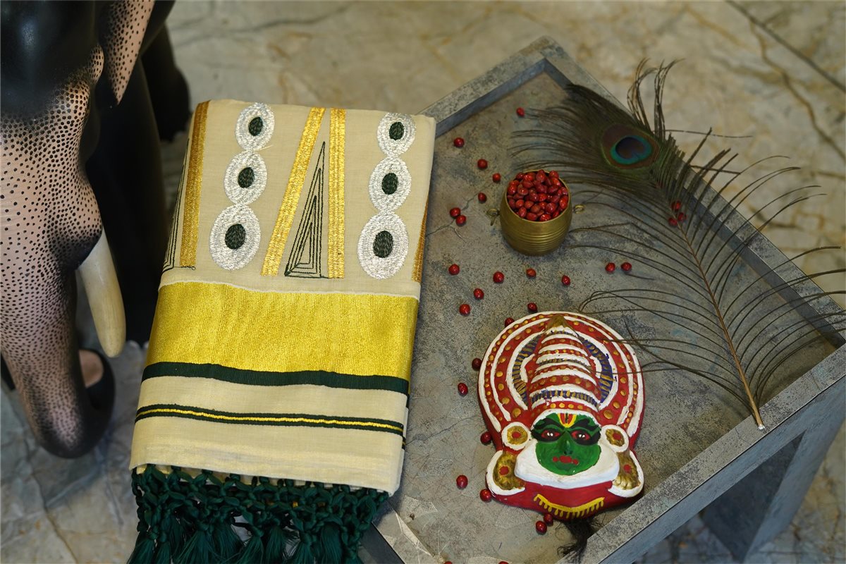 Cream skirt with yellow stripes paired with a purple blouse adorned with golden motifs