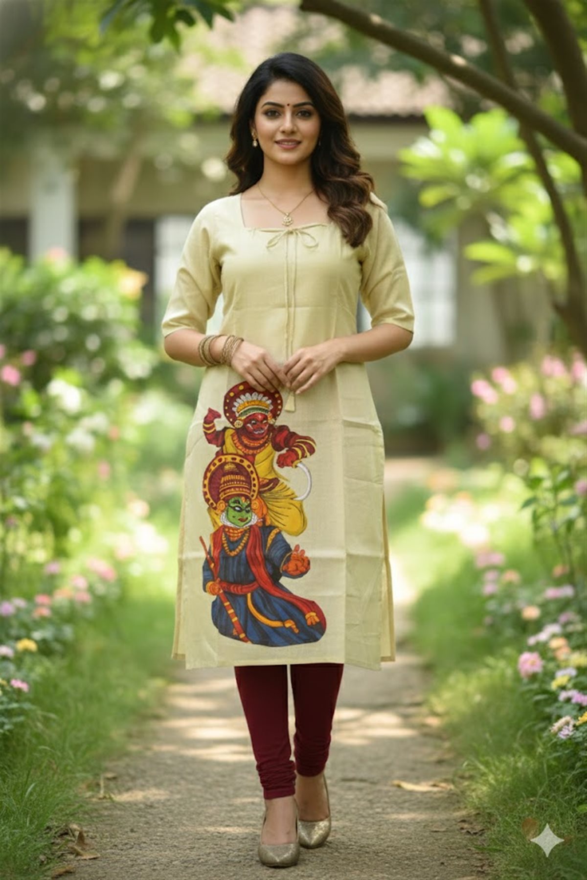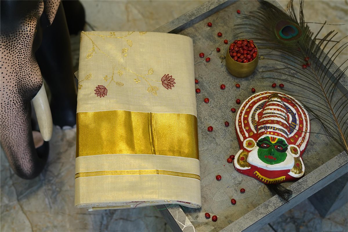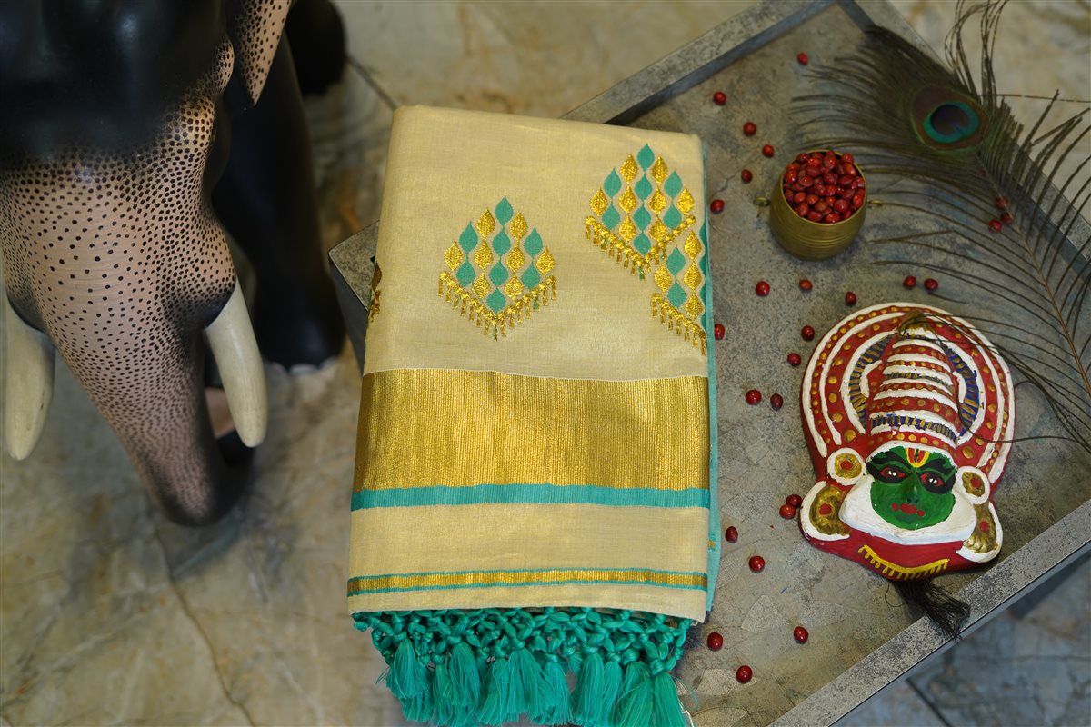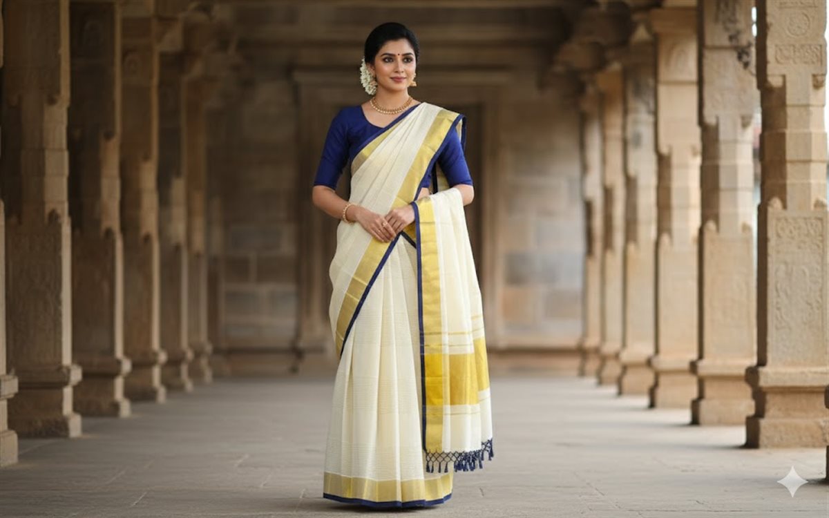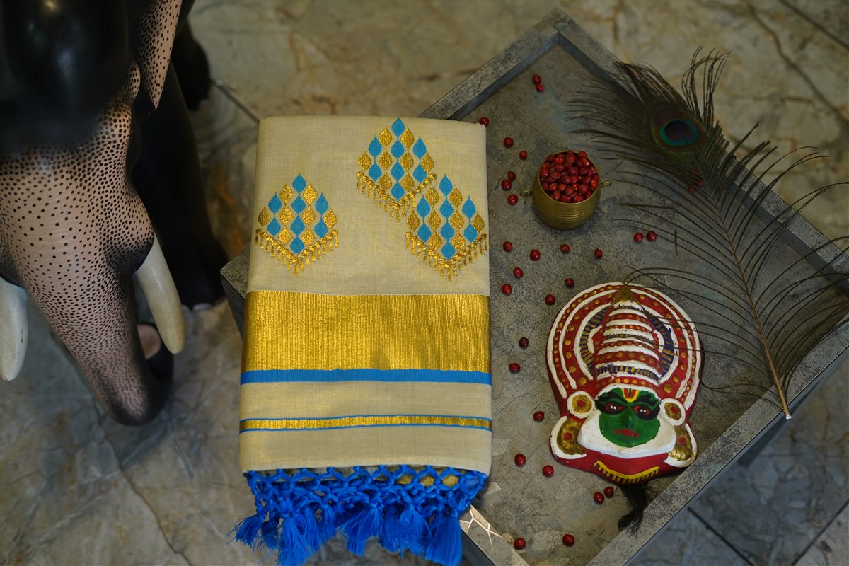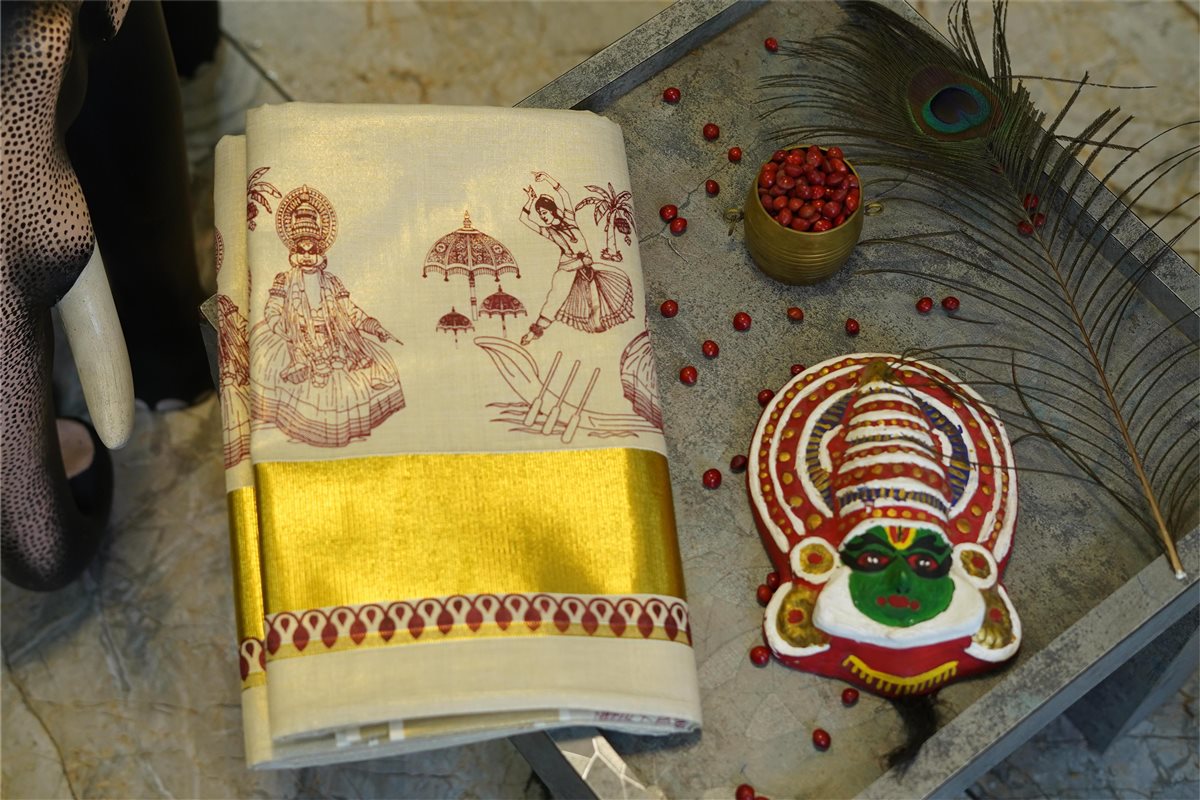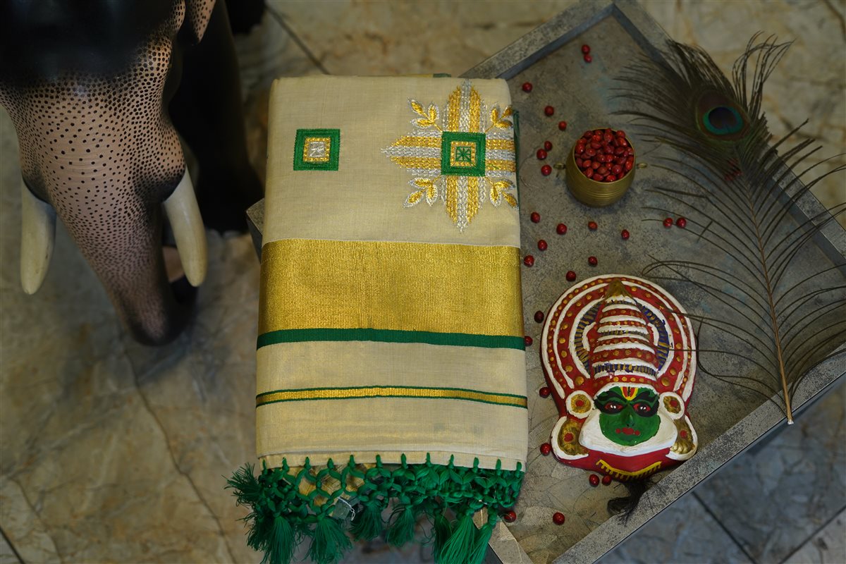 Cream skirt with yellow stripes paired with a purple blouse adorned with golden motifs