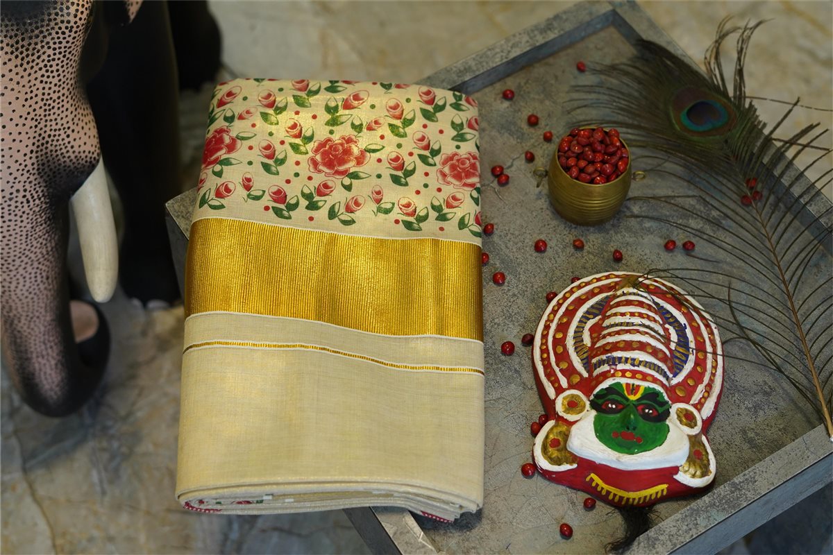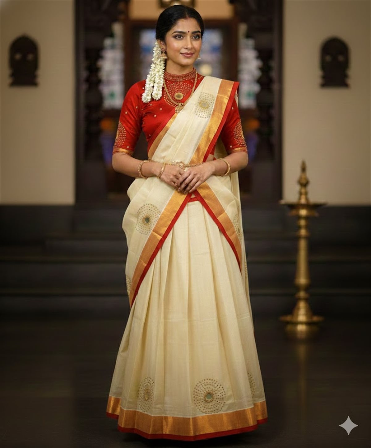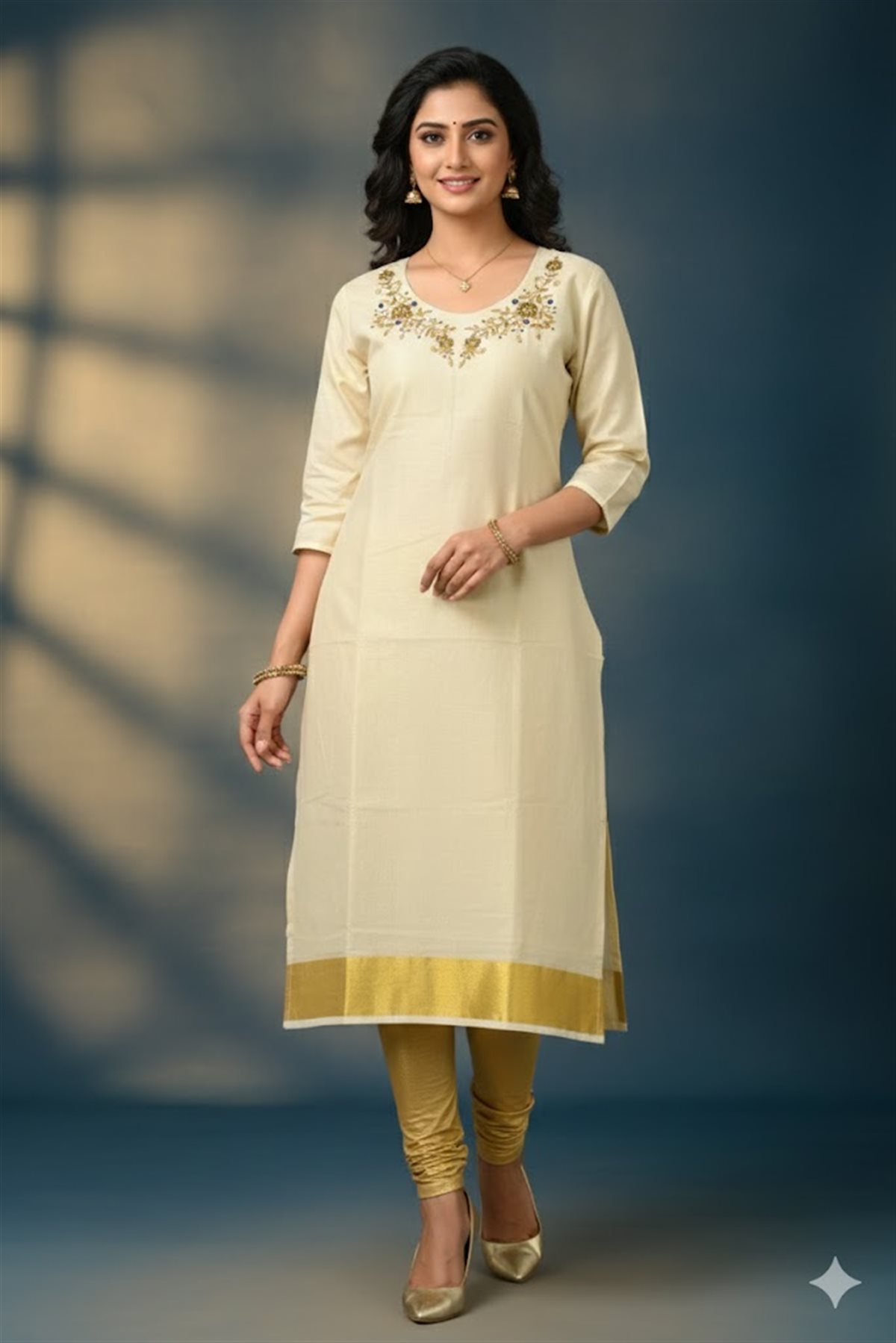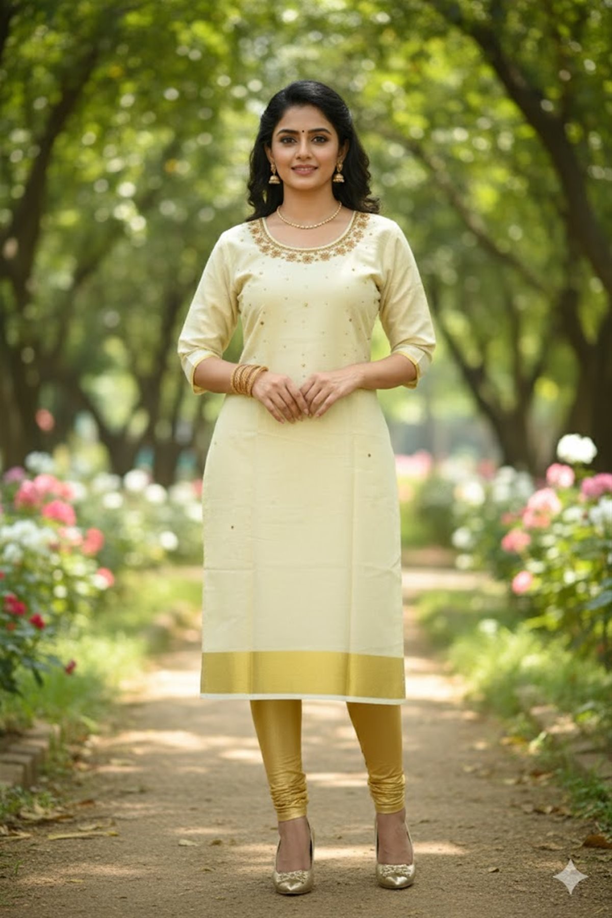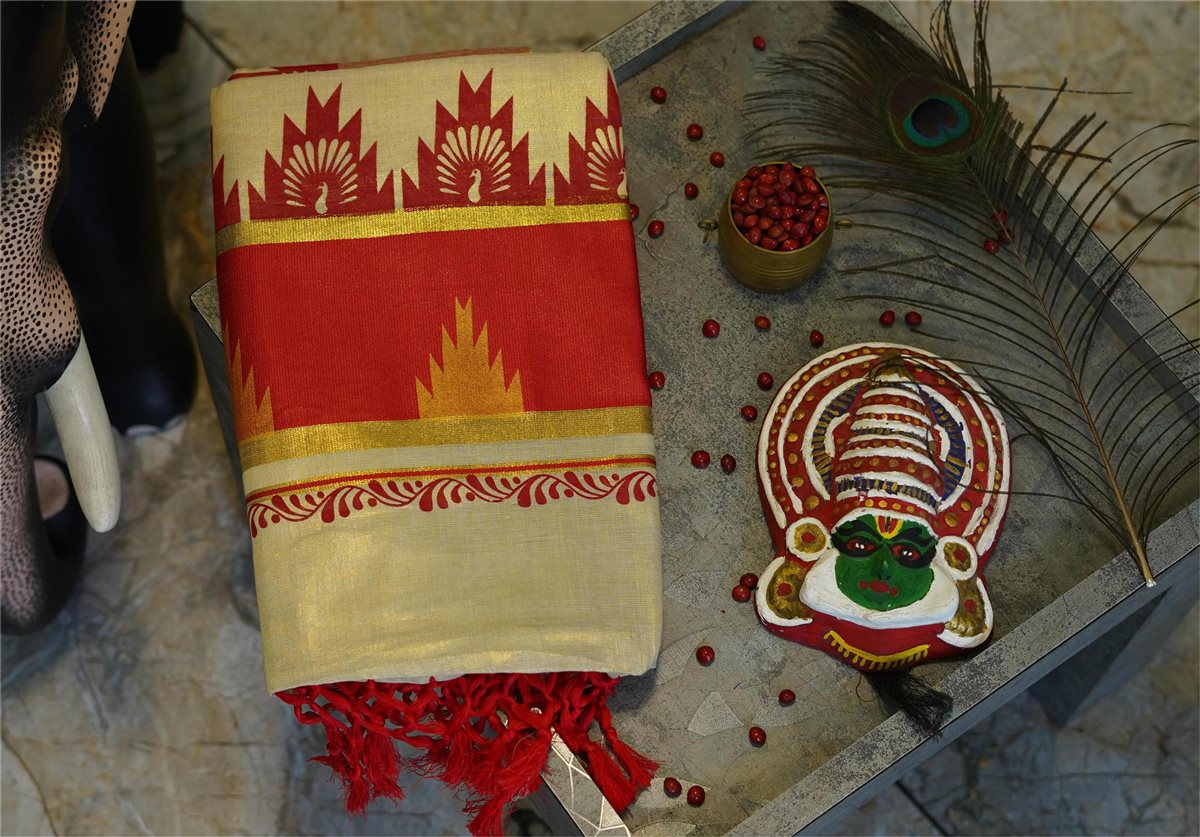 Cream skirt with yellow stripes paired with a purple blouse adorned with golden motifs