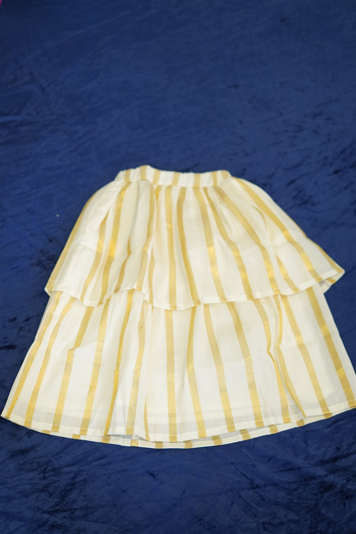 Skirt: Cream base with vertical yellow stripes, layered waist design for volume