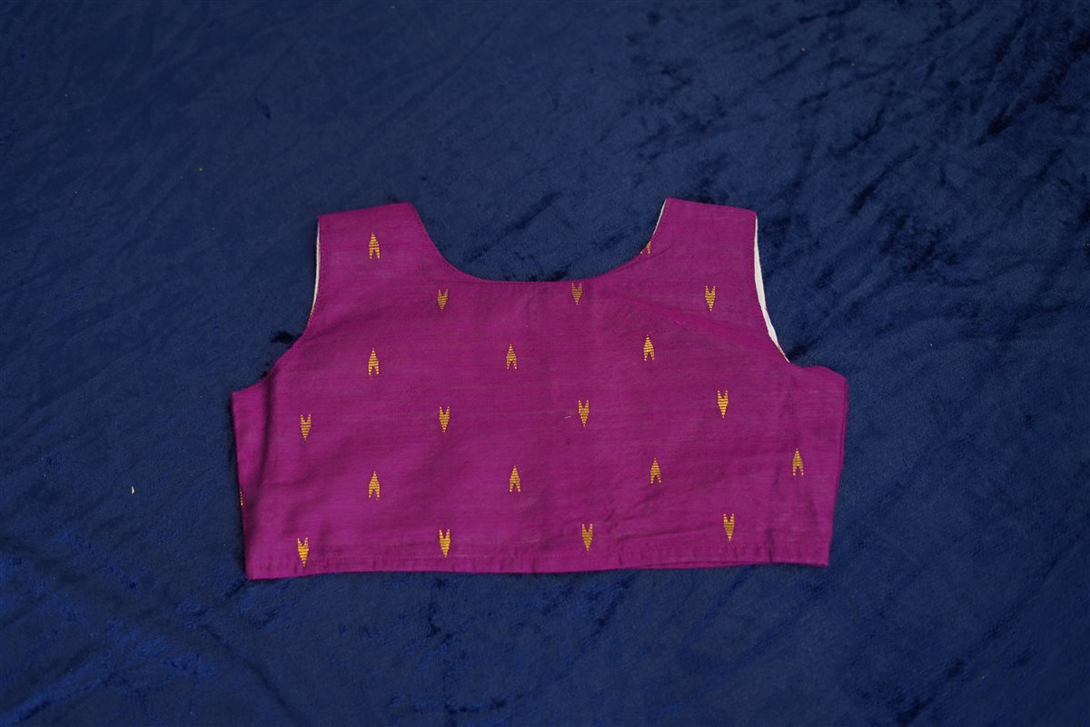Top (Blouse): Sleeveless purple blouse with golden woven motifs