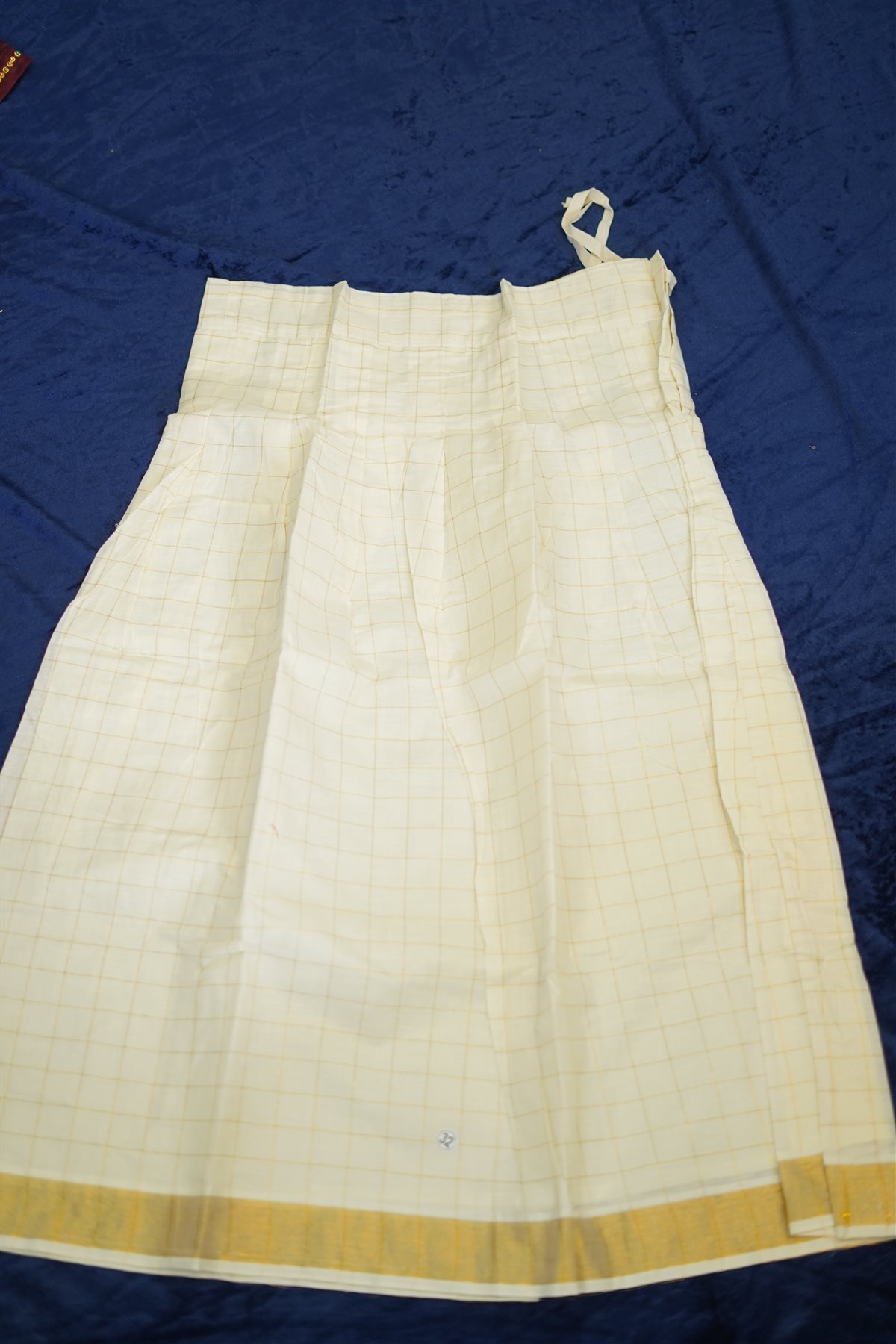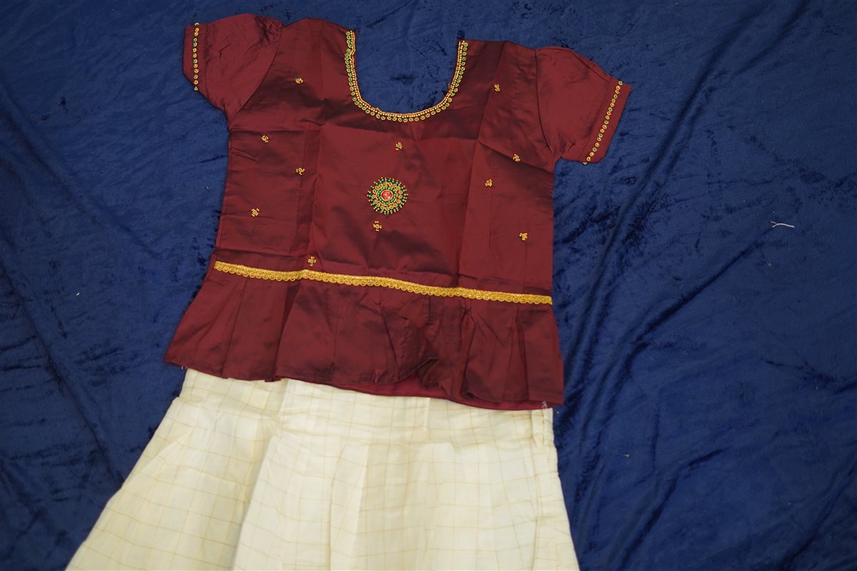 Traditional Indian Kids wear(Pattu Pavada style) Top (Blouse): Sleeveless Maroon blouse with golden line. Skirt: Cream base with vertical yellow stripes.