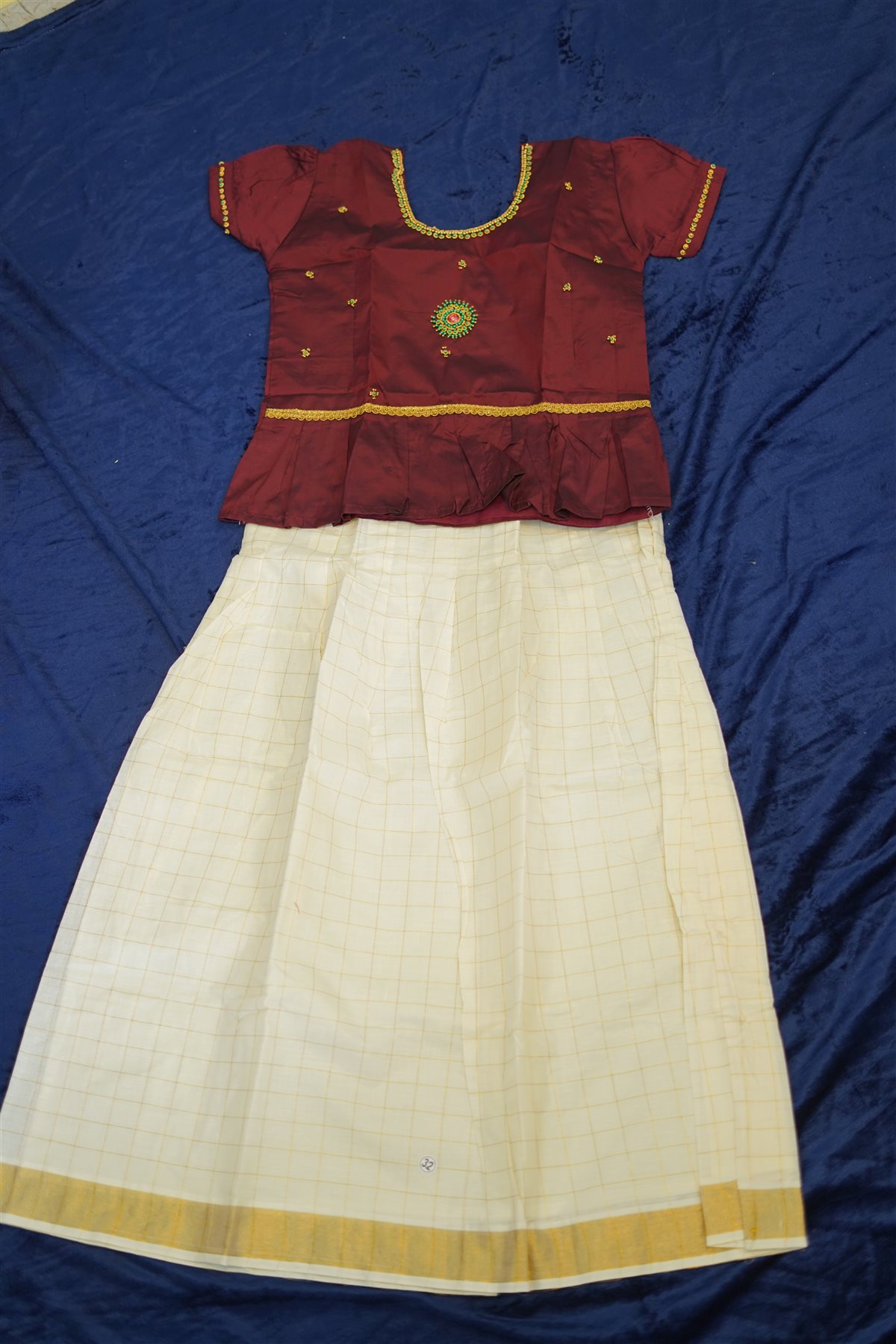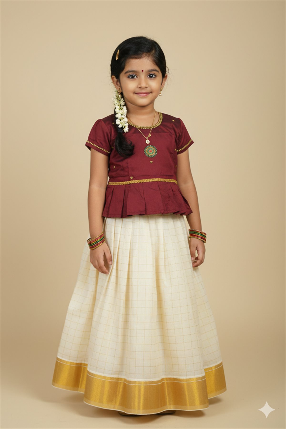 A graceful Kerala traditional pavada set featuring a rich maroon blouse paired with an off-white Kasavu skirt accented by a classic golden border, perfect for festive occasions.