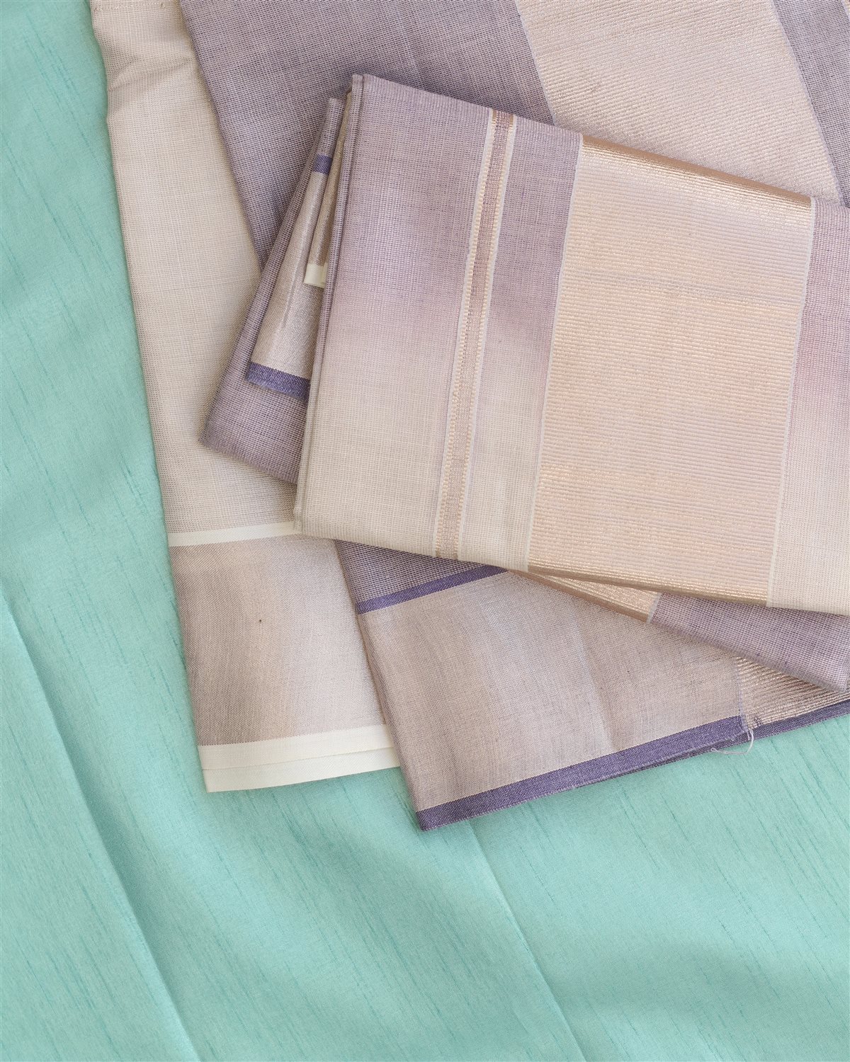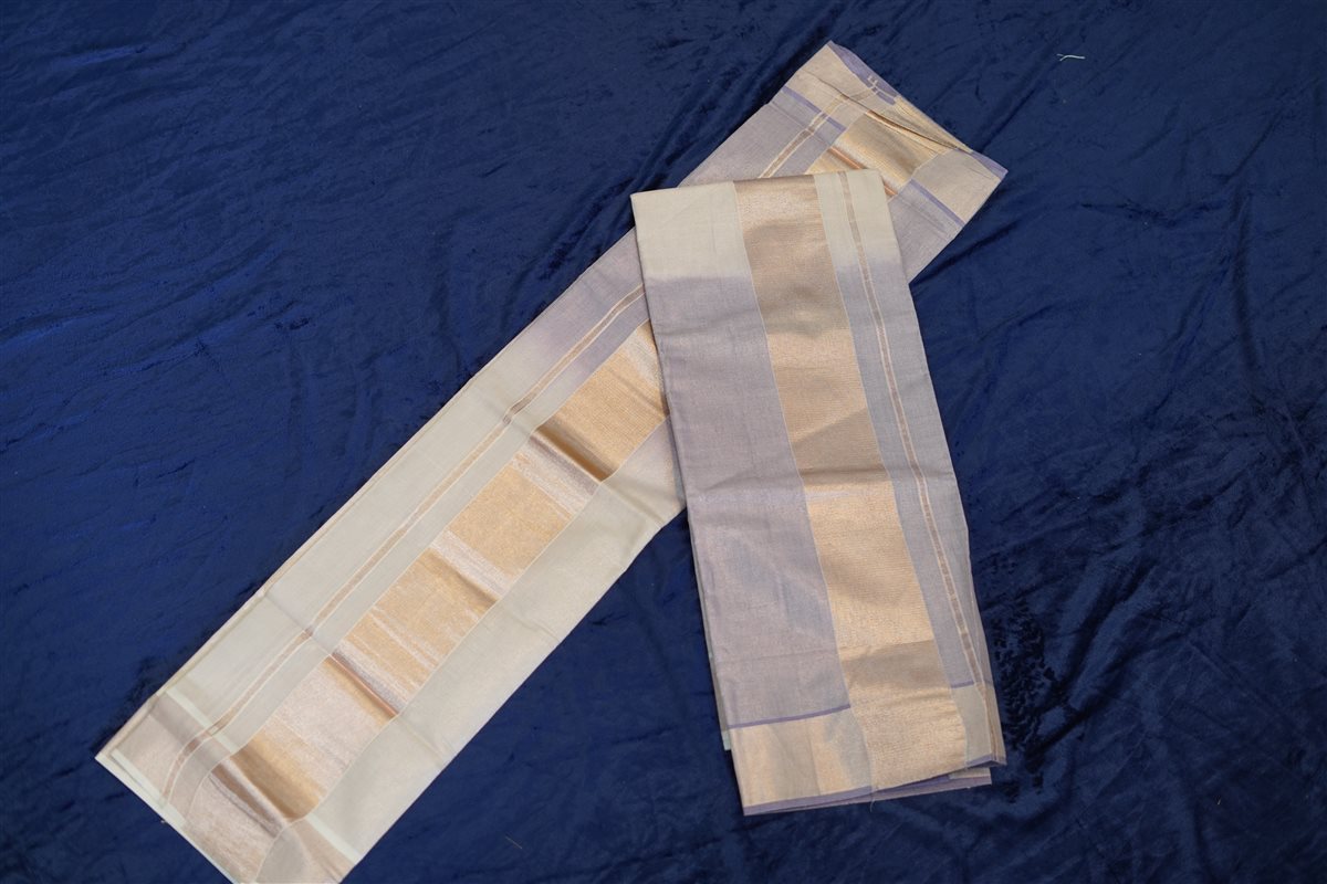 Classic Kerala set mundu in soft cream with a broad golden kasavu panel and subtle grey-toned borders, offering a timeless, elegant traditional look.