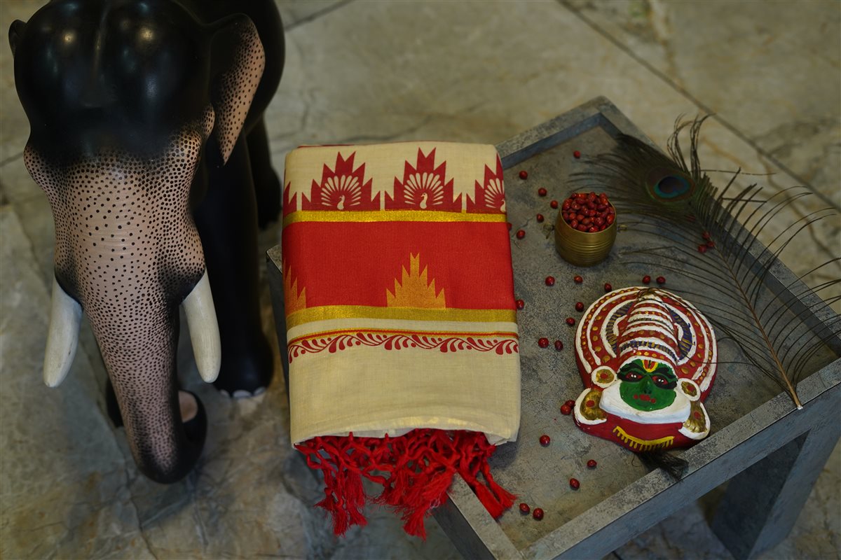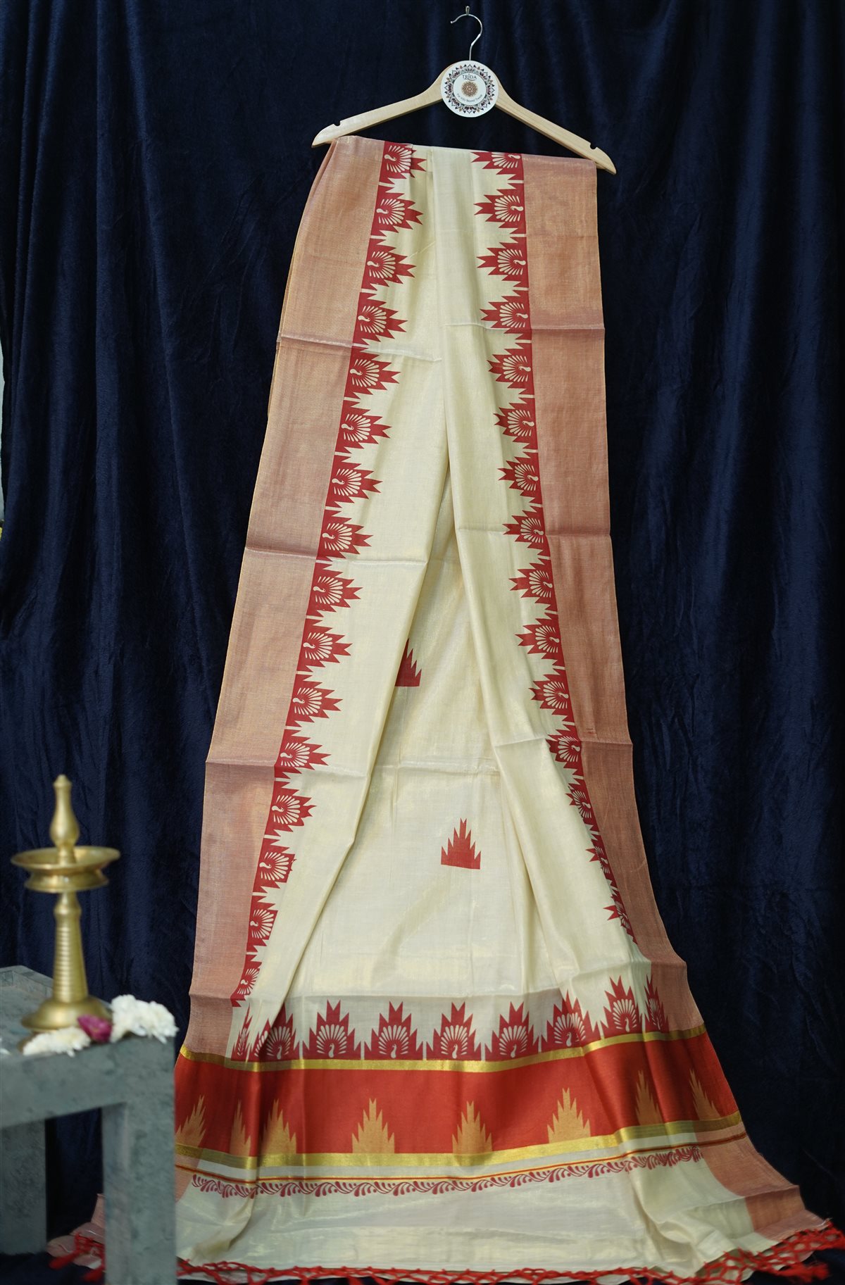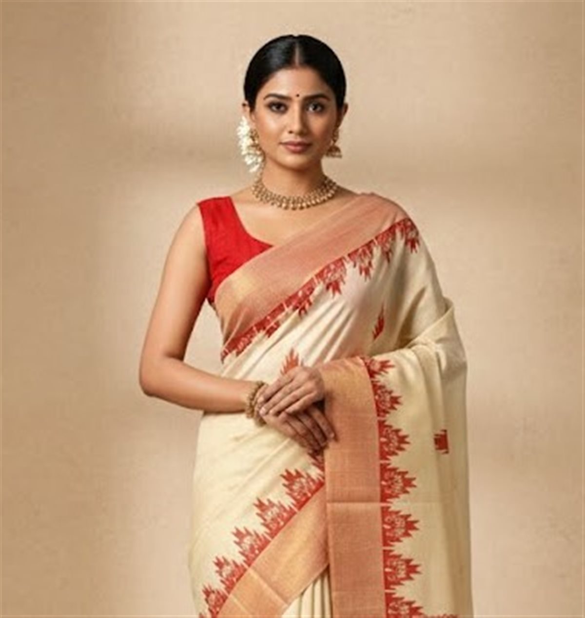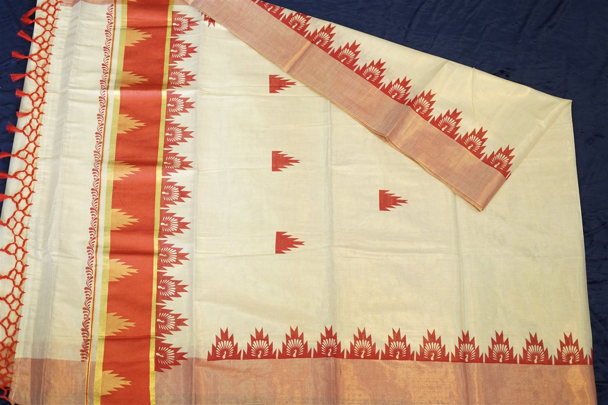 Celebrate heritage elegance with this beautiful cream cotton saree highlighted by rich rust-red and gold accents. The saree features striking geometric and temple-style motifs along the border and pallu, inspired by traditional Indian handloom artistry