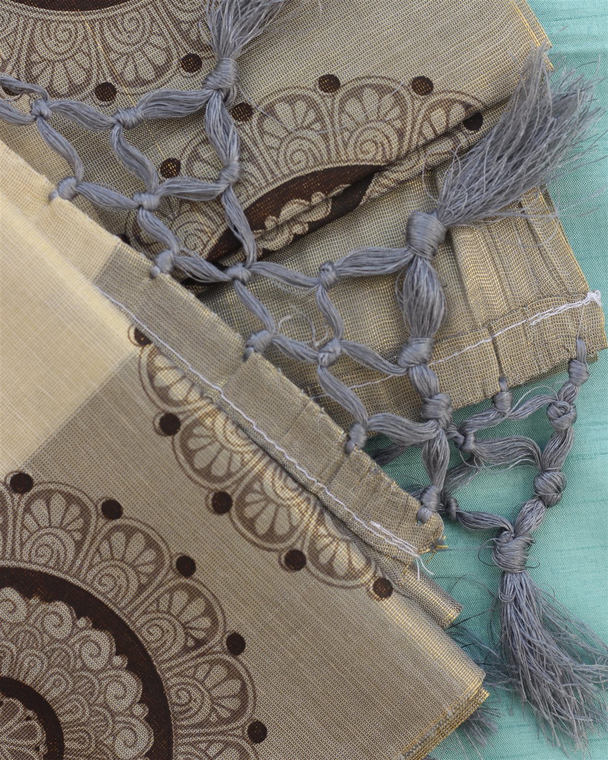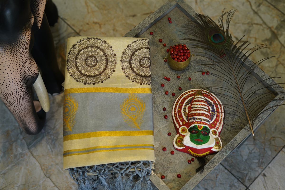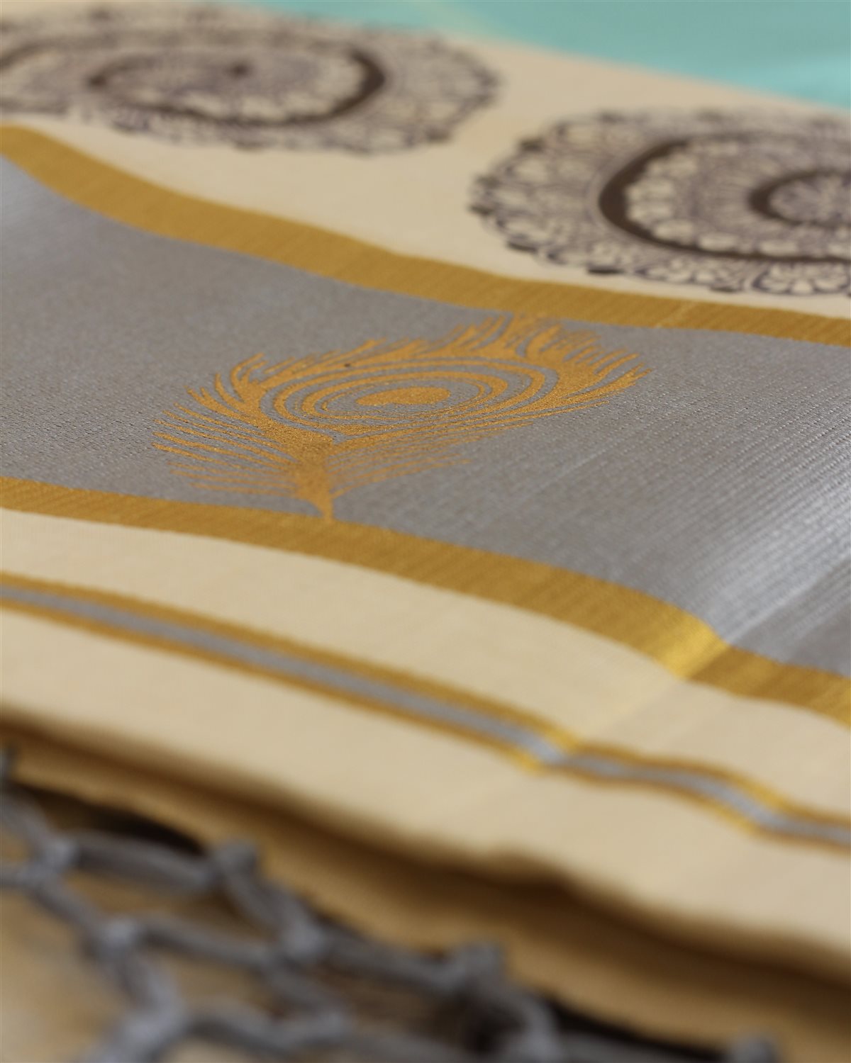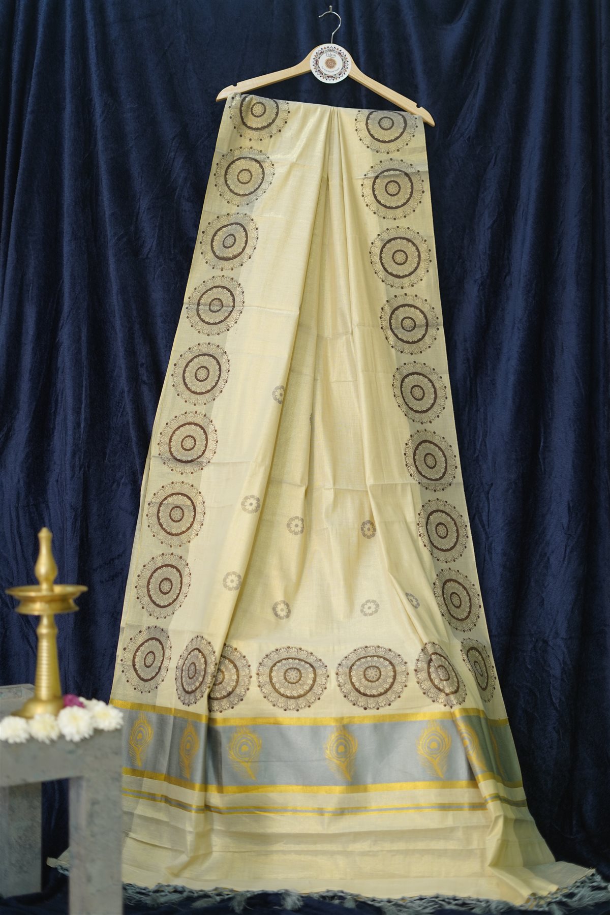 Light cream saree with grid-like circular motifs, highlighted by a gold and brown border featuring ornate circles and peacock feather designs on a light blue base.