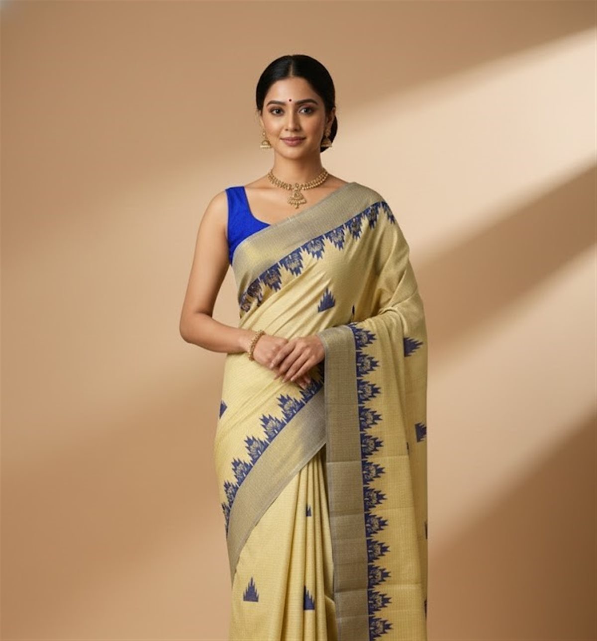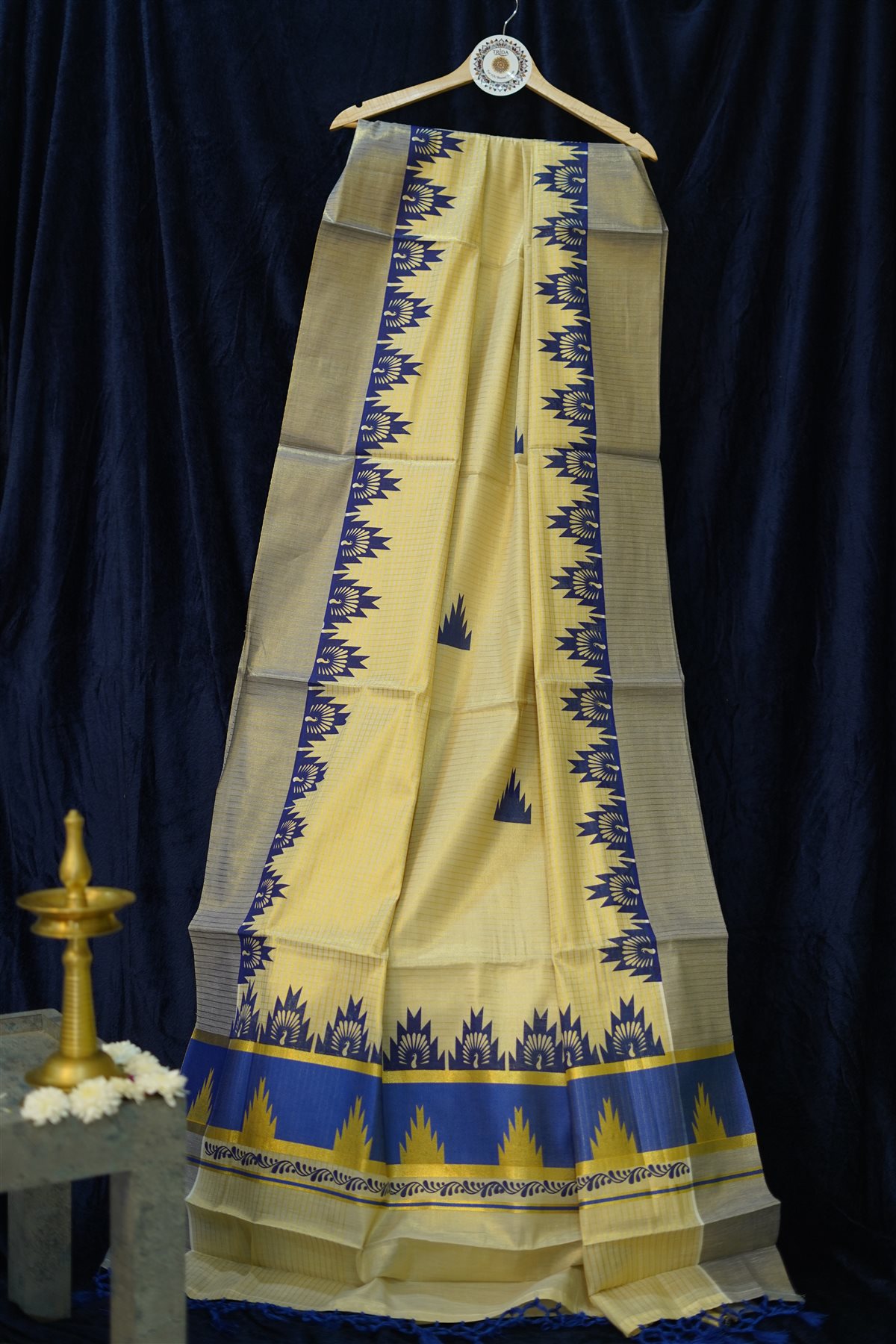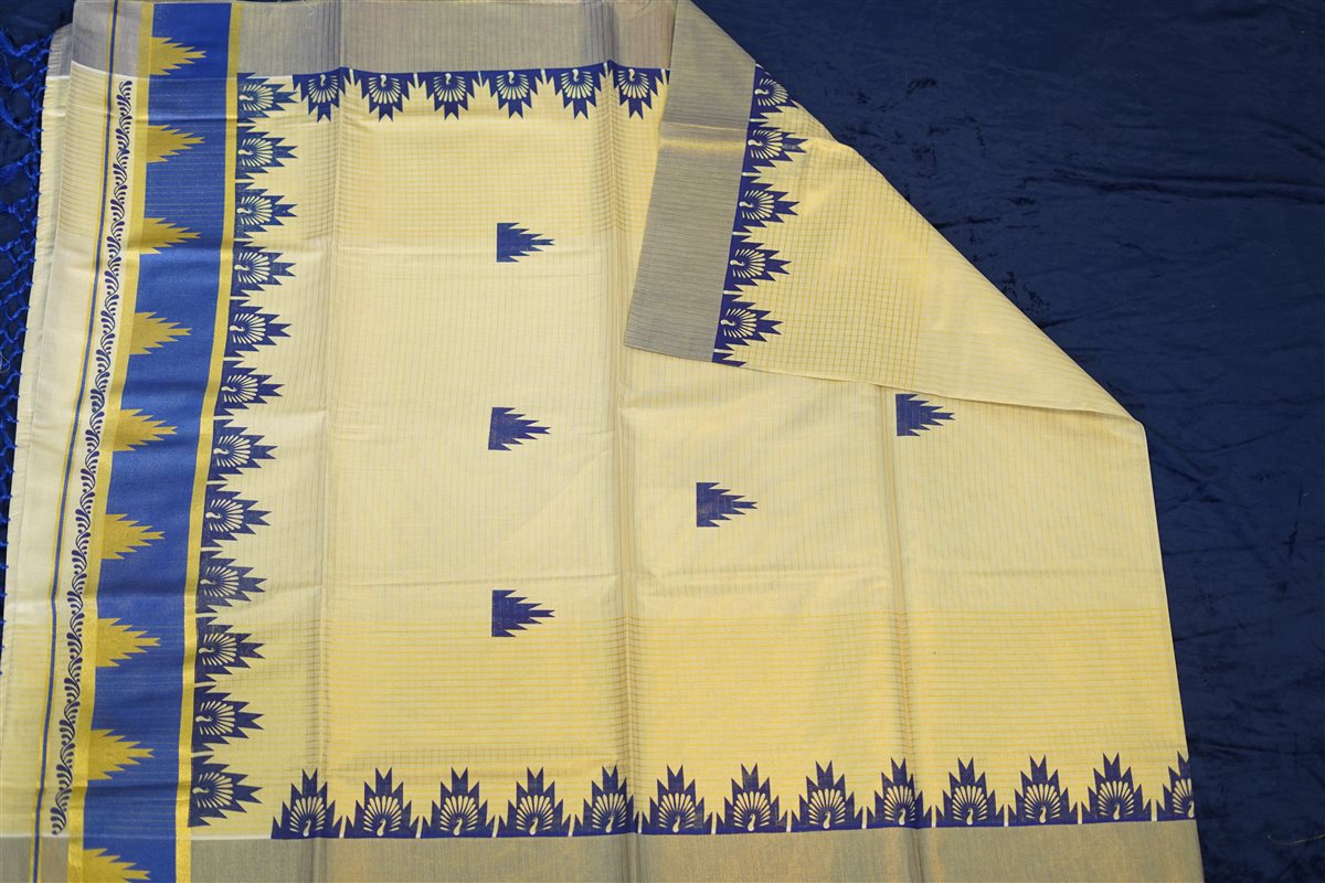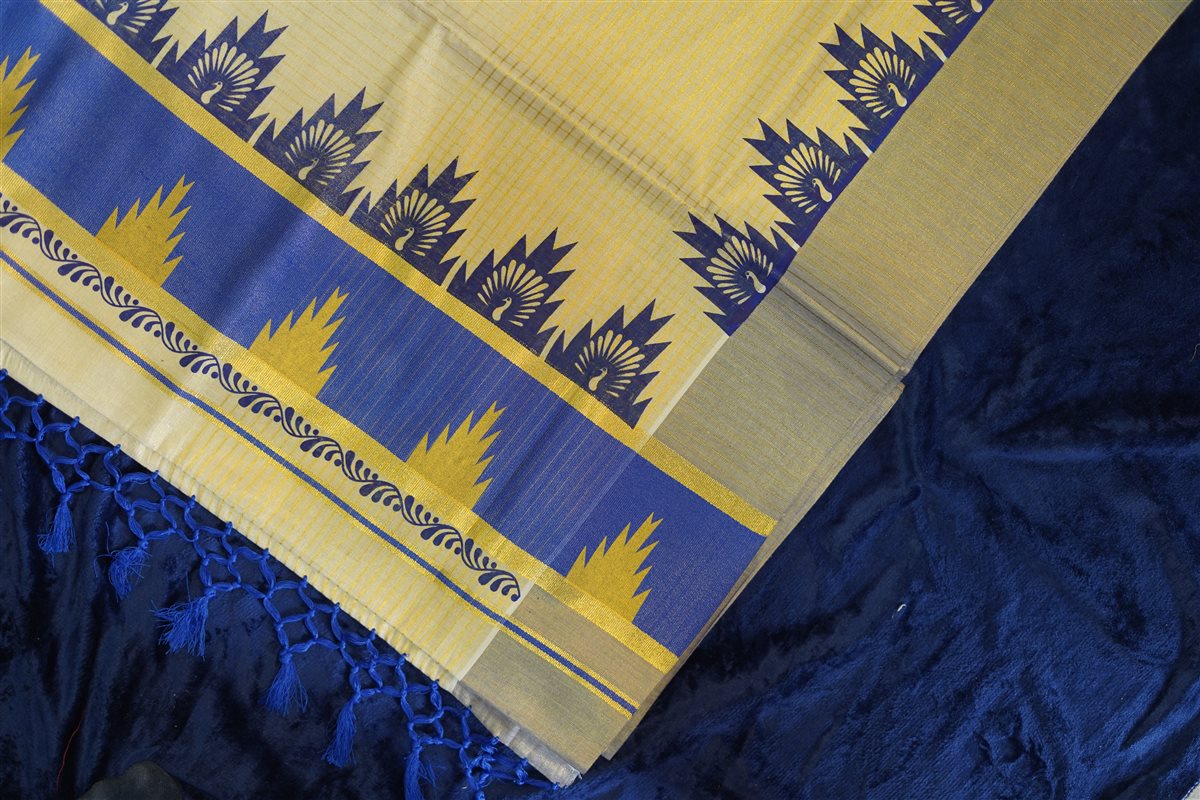 A magnificent Temple (Gopuram) border in deep royal blue, accented with intricate gold zari-inspired temple motifs.Richly detailed with striking blue panels, gold highlights, and finished with handcrafted royal blue tassels for a graceful drape.