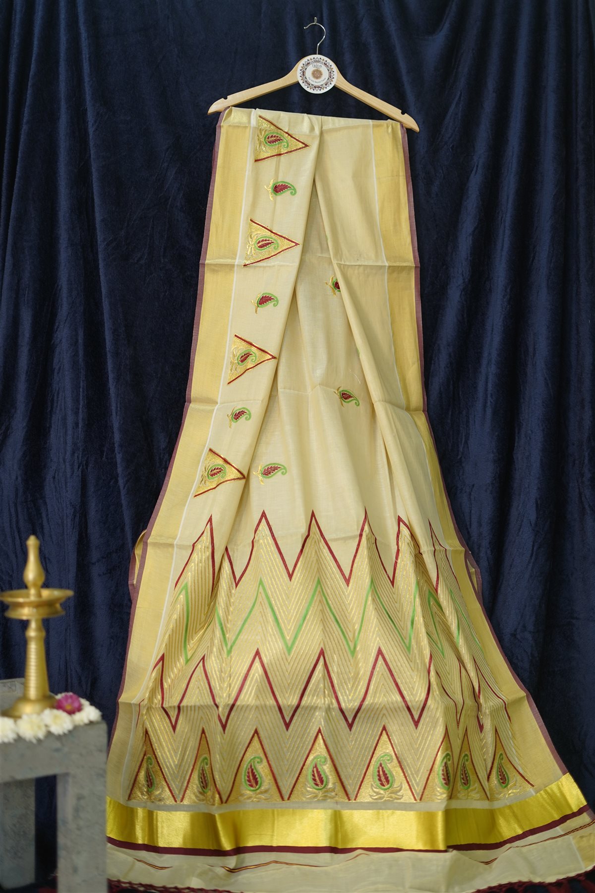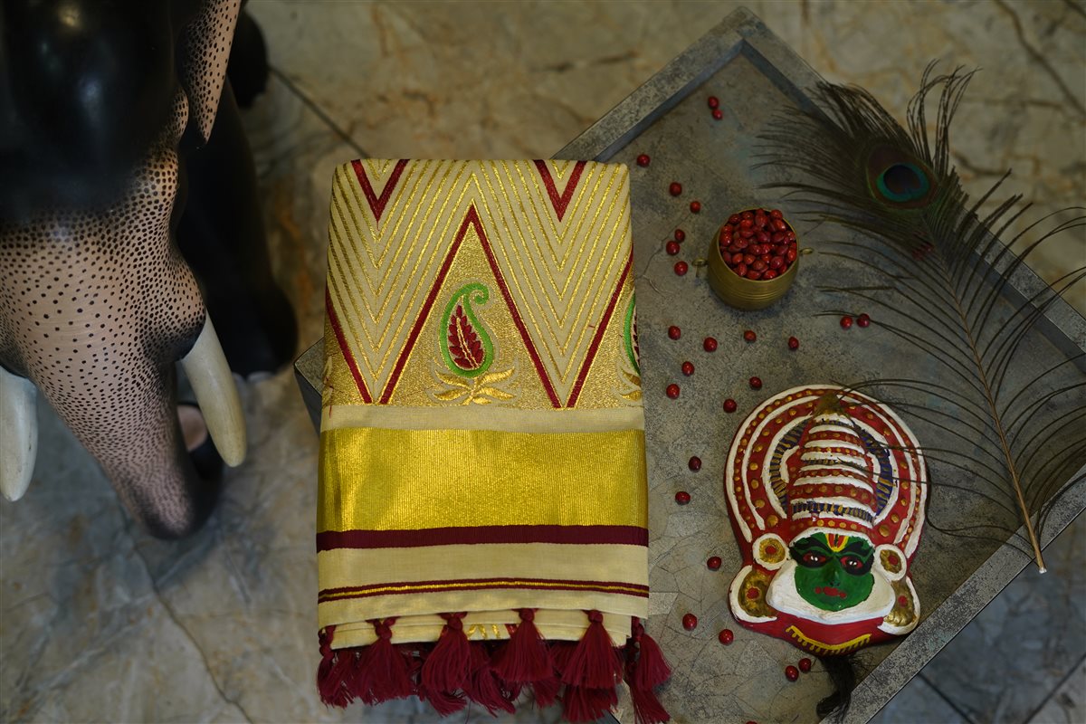 Fabric: 100% Tissue Silk Color Palette: Traditional Ivory/Cream, Royal Gold, Crimson Red, and Forest Green. Dimensions: * Saree: 5.5 Meters. Blouse: 0.8 Meters Occasion: Exceptional for Onam celebrations, temple festivities, and cultural events. Special Feature: Features dense, high-quality embroidery and a signature hand-woven gold border.