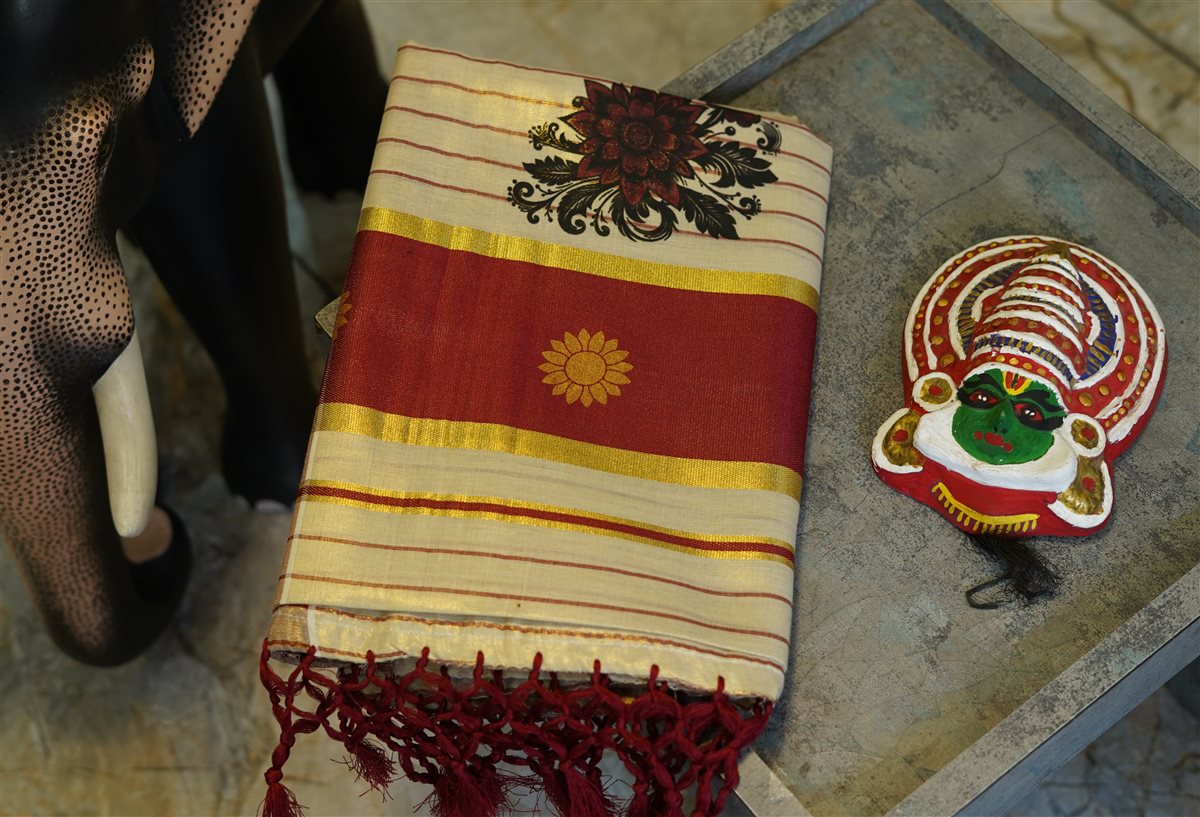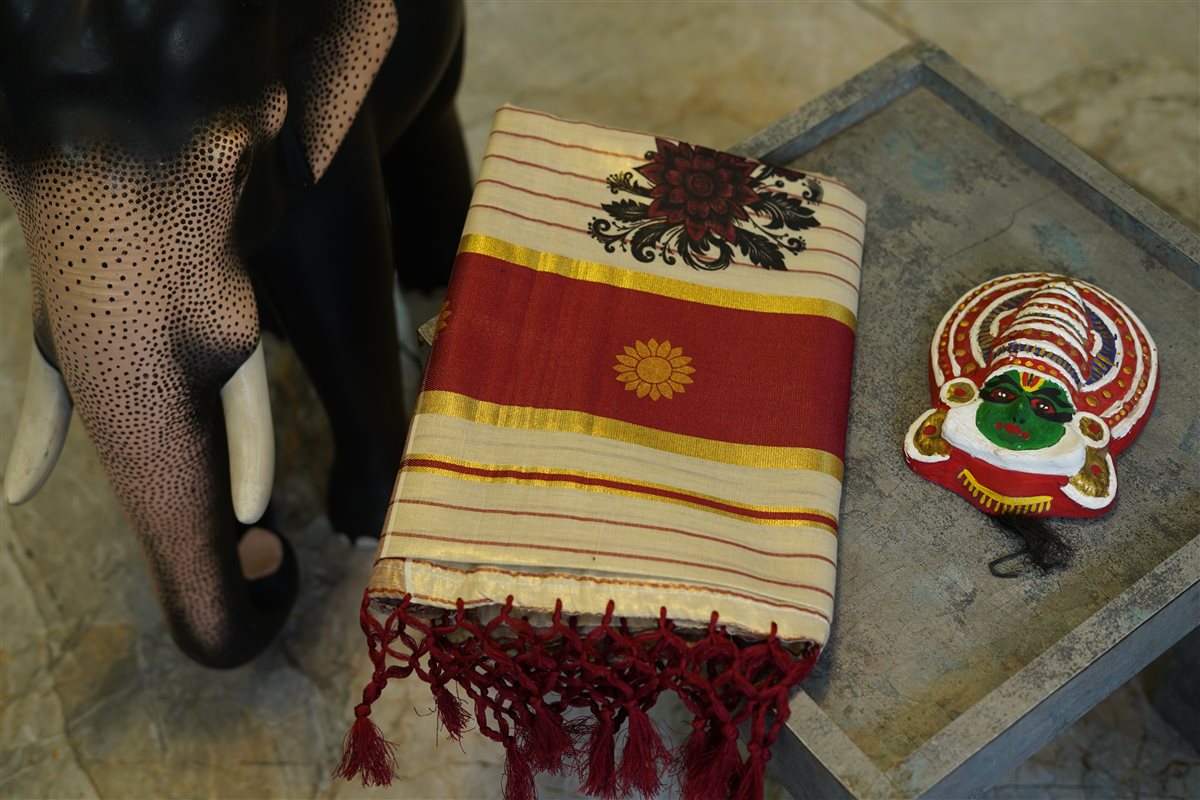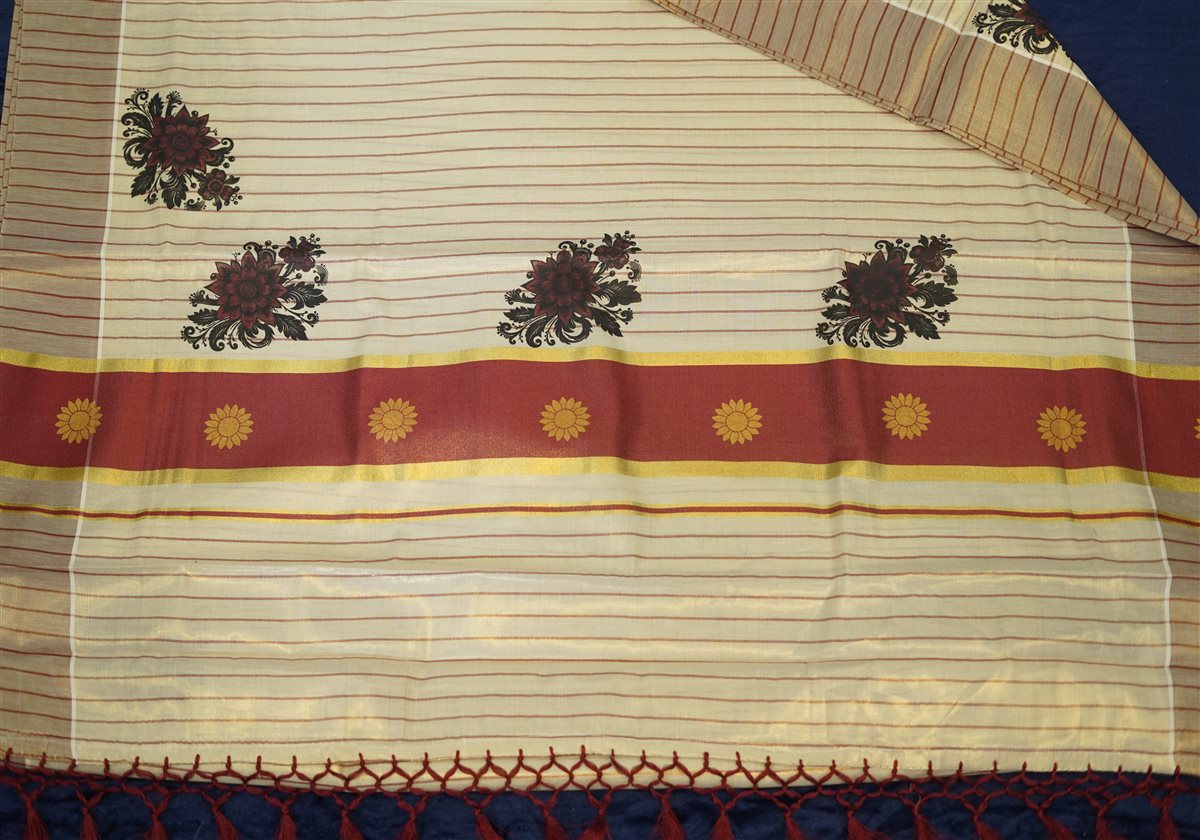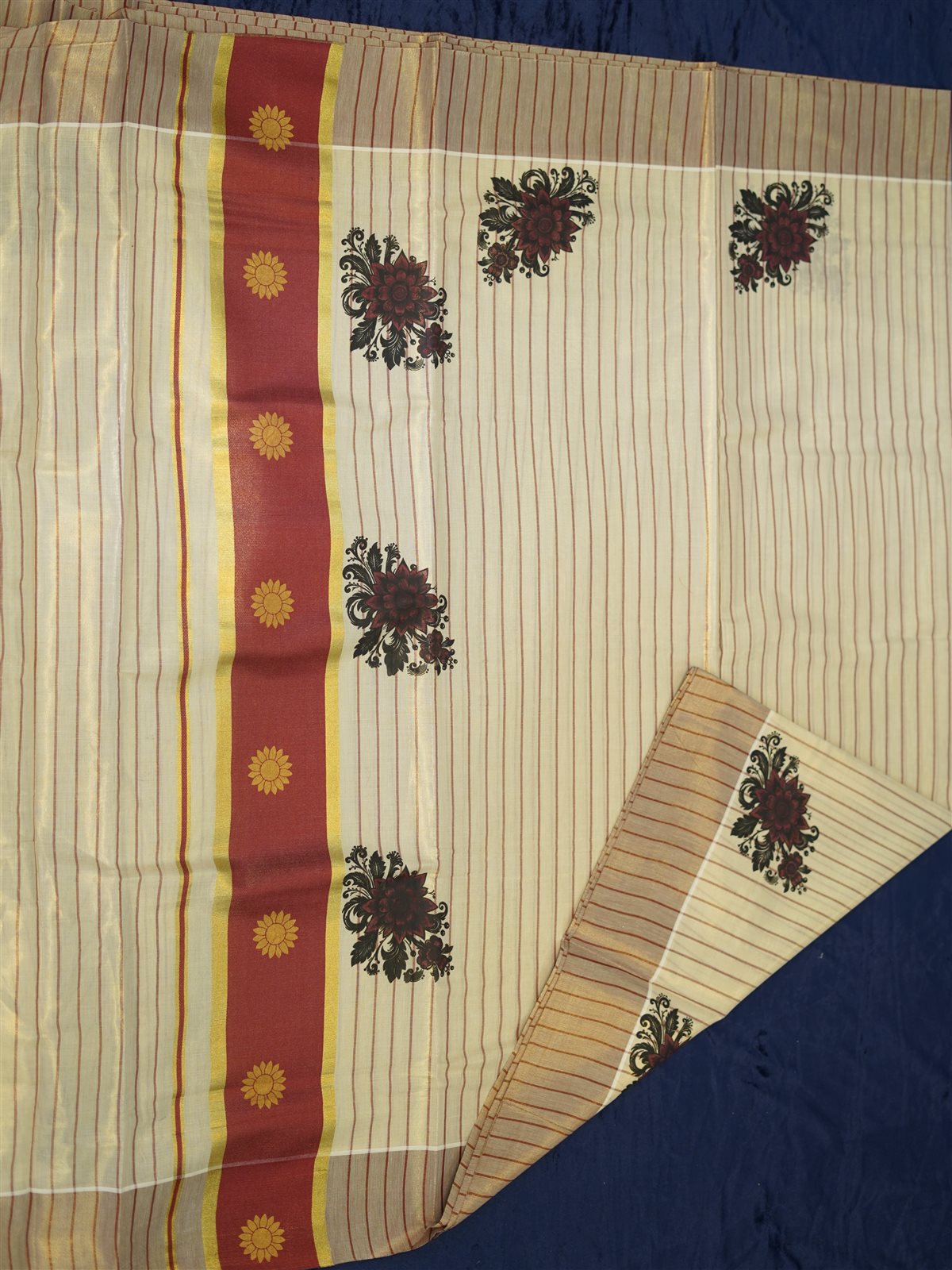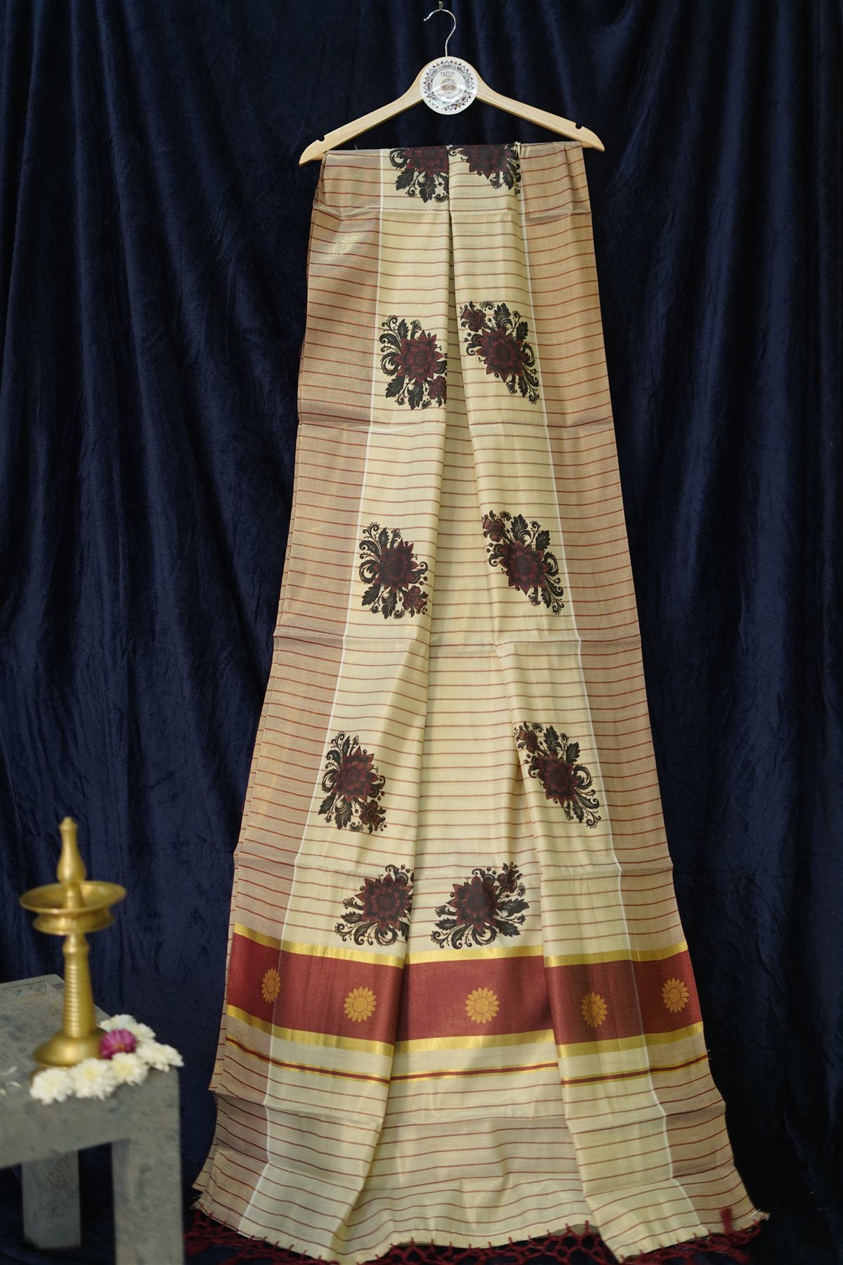 Cream saree with vertical stripes and maroon floral motifs, finished with a bold maroon border adorned with yellow floral patterns