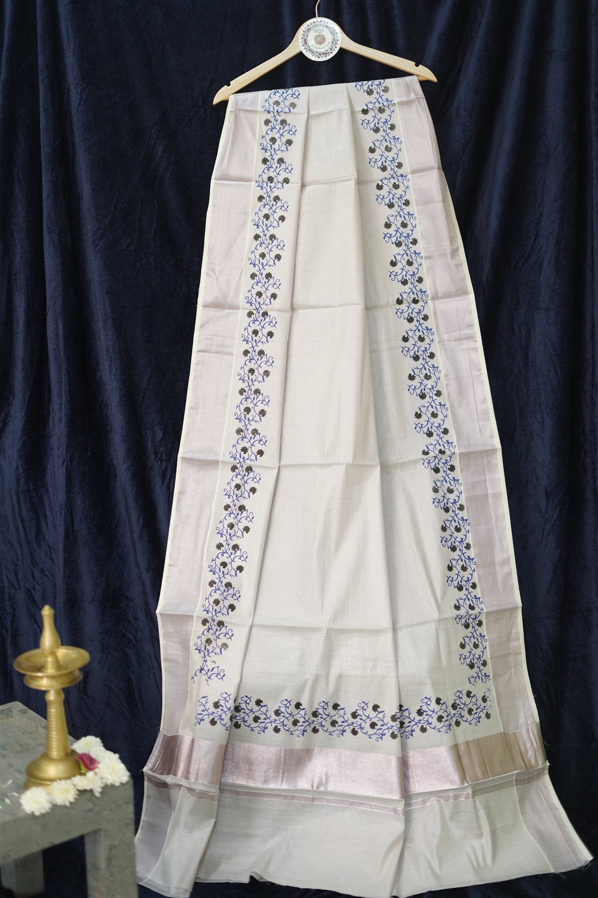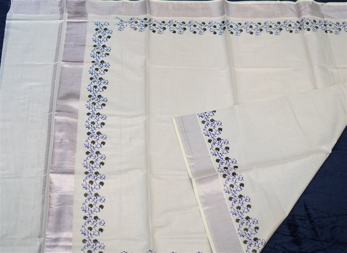 Off‑white silk saree with subtle sheen, detailed by blue and copper floral borders and a lavender pallu accent.