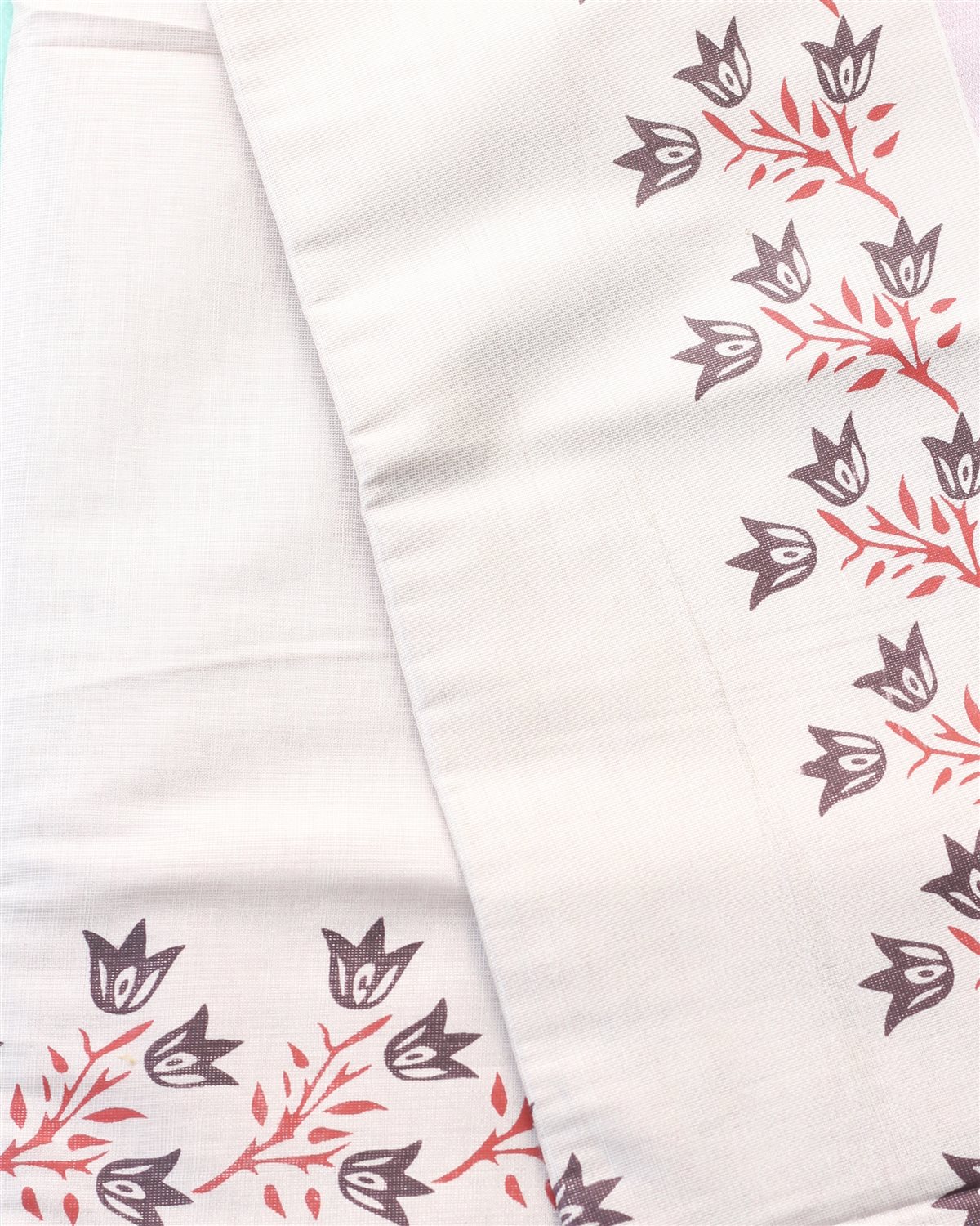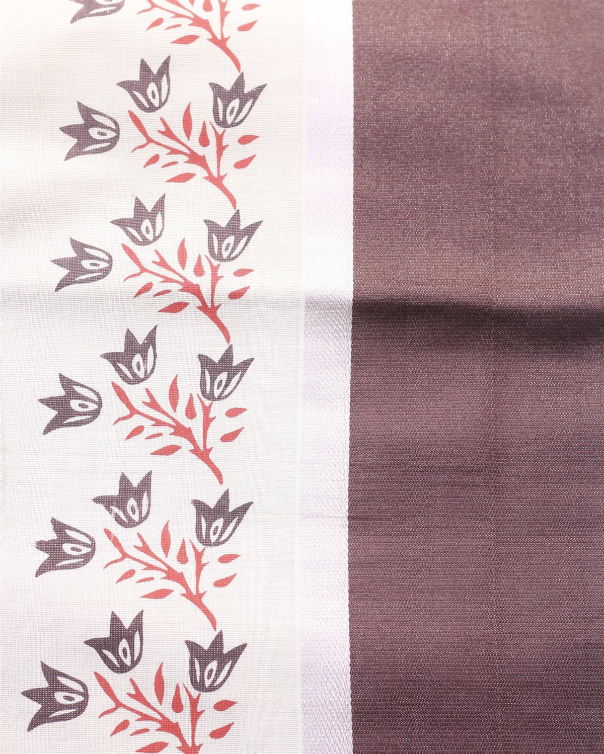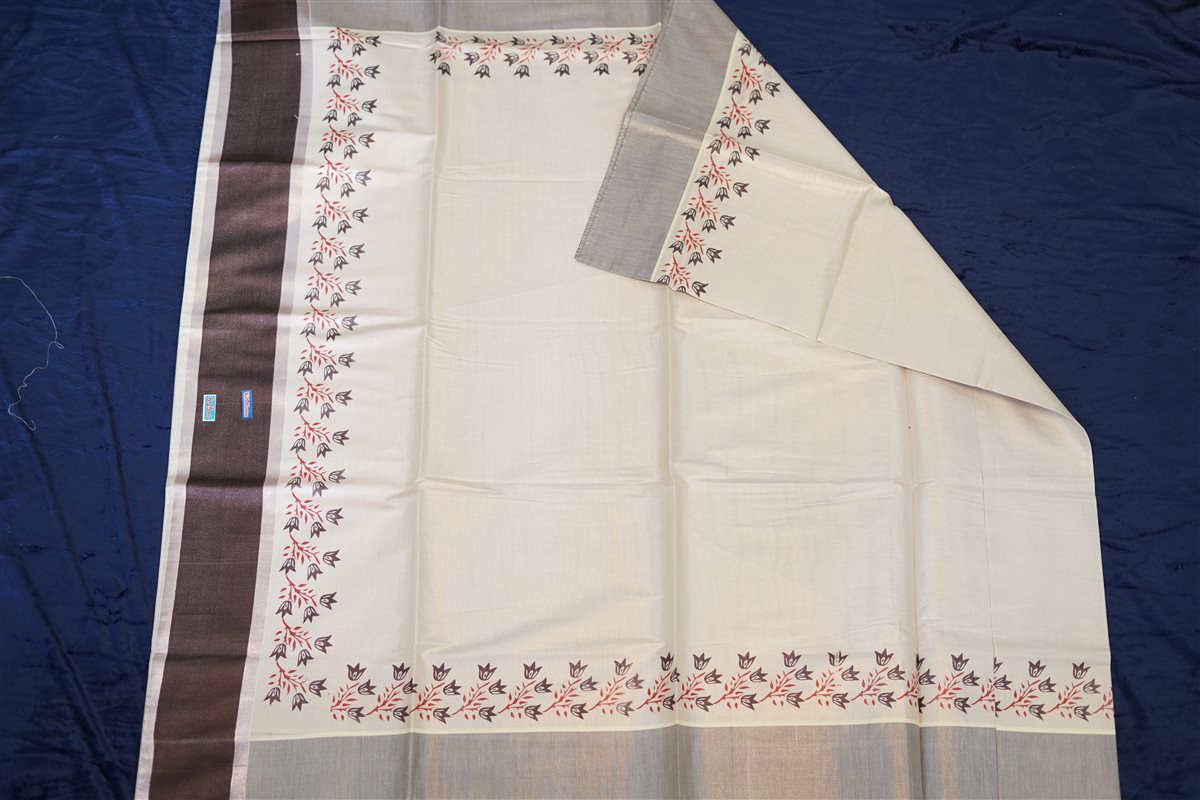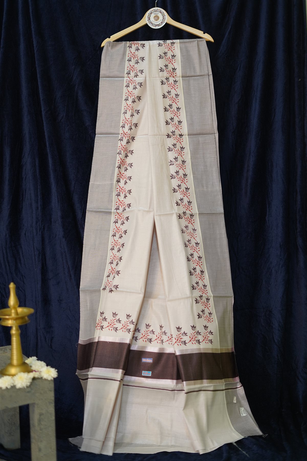 Cream saree with floral motifs and a wide dark brown border accented by Copper and red designs