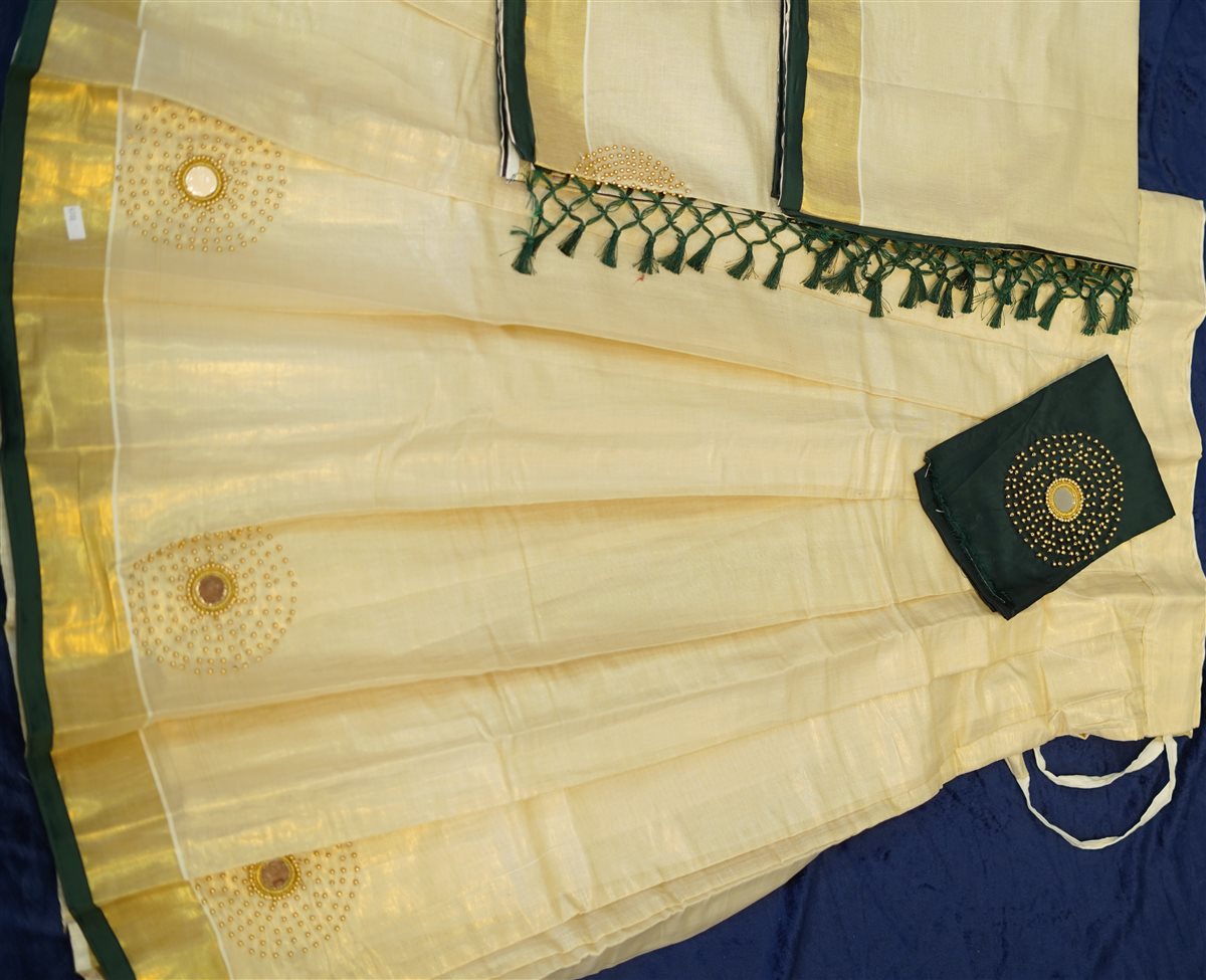 Graceful cream Kerala davani with rich emerald green mandala motifs and golden kasavu accents, paired with a matching embroidered blouse.