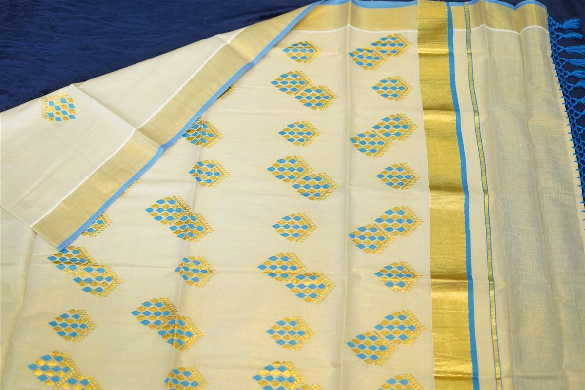 Cream kasavu saree adorned with royal blue diamond motifs and a rich gold border, finished with elegant blue accents for a striking traditional look.